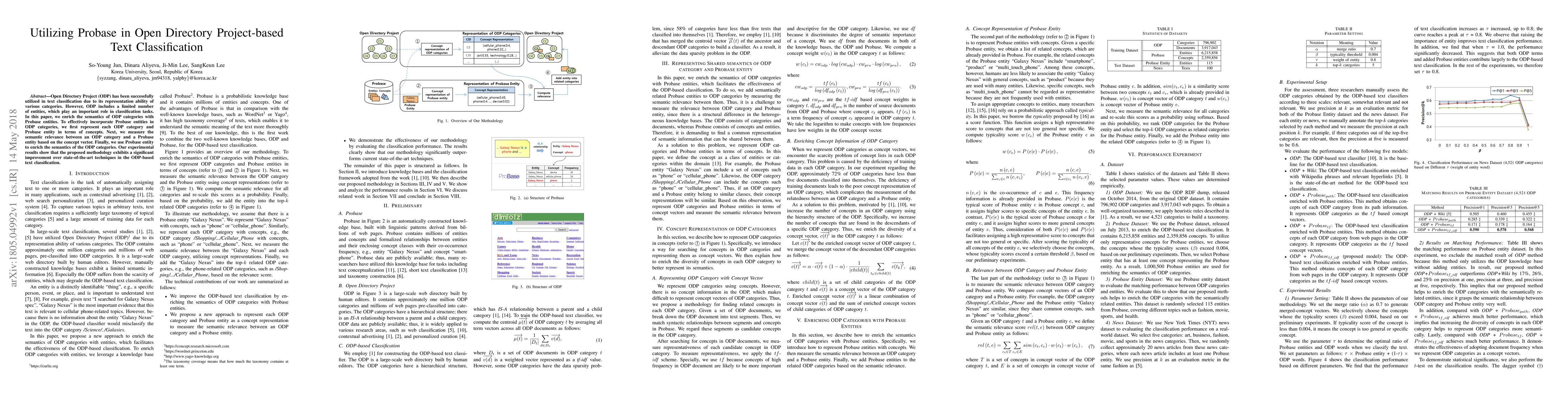 This paper enriches the Open Directory Project (ODP) categories with Probase entities to improve text classification. The methodology involves representing ODP categories and Probase entities as concepts and measuring their semantic relevance, leading to significant improvements over existing techniques.