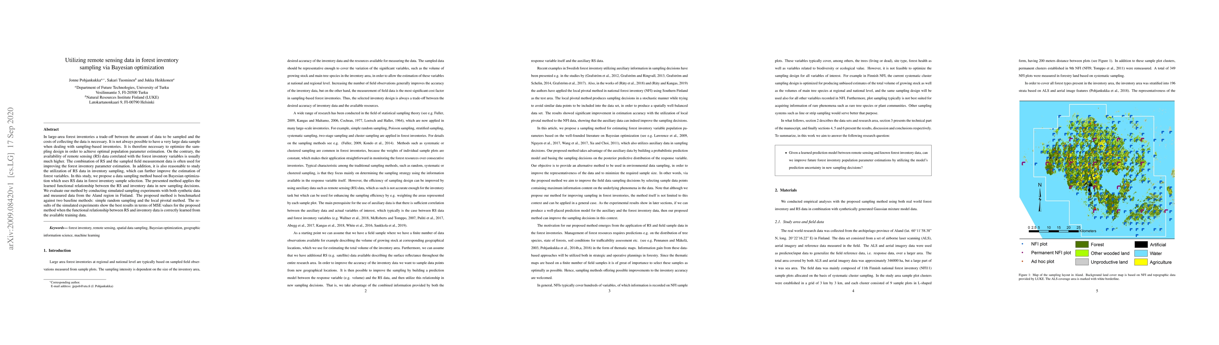 This paper proposes a Bayesian optimization method for forest inventory sampling that leverages remote sensing data to improve parameter estimation. The method outperforms simple random sampling and the local pivotal method based on simulated experiments using synthetic and real data from Finland's Aland region.