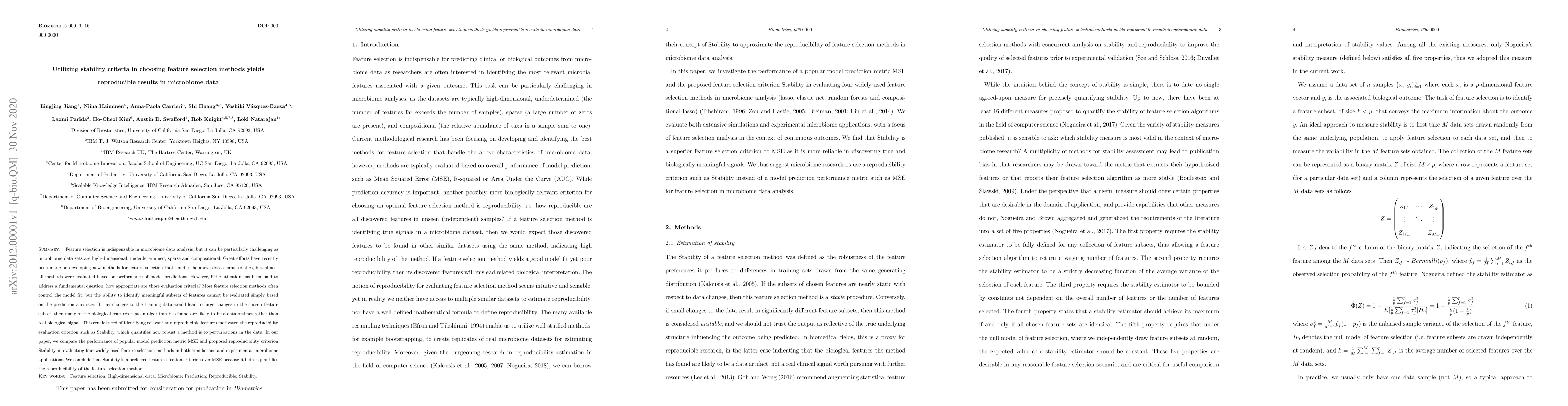 A new feature selection method called Stability is proposed to evaluate reproducibility in microbiome data analysis, outperforming traditional metrics like MSE.