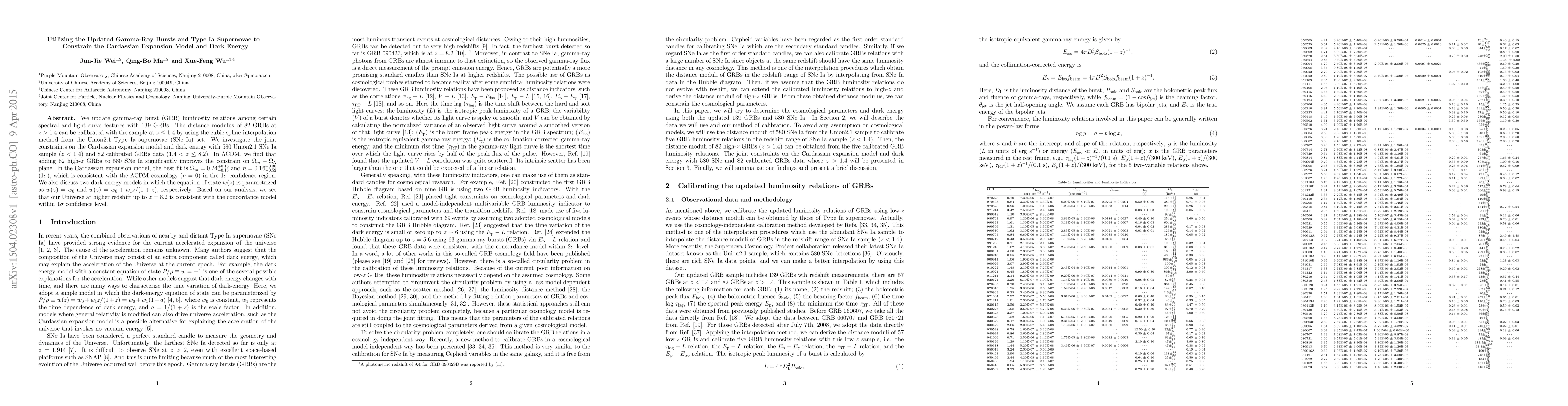 This paper updates gamma-ray burst luminosity relations and calibrates their distance moduli using Type Ia supernovae data. It then constrains the Cardassian expansion model and dark energy using a combined dataset of supernovae and calibrated gamma-ray bursts, finding consistency with the $\Lambda$CDM model and exploring two dark energy models.