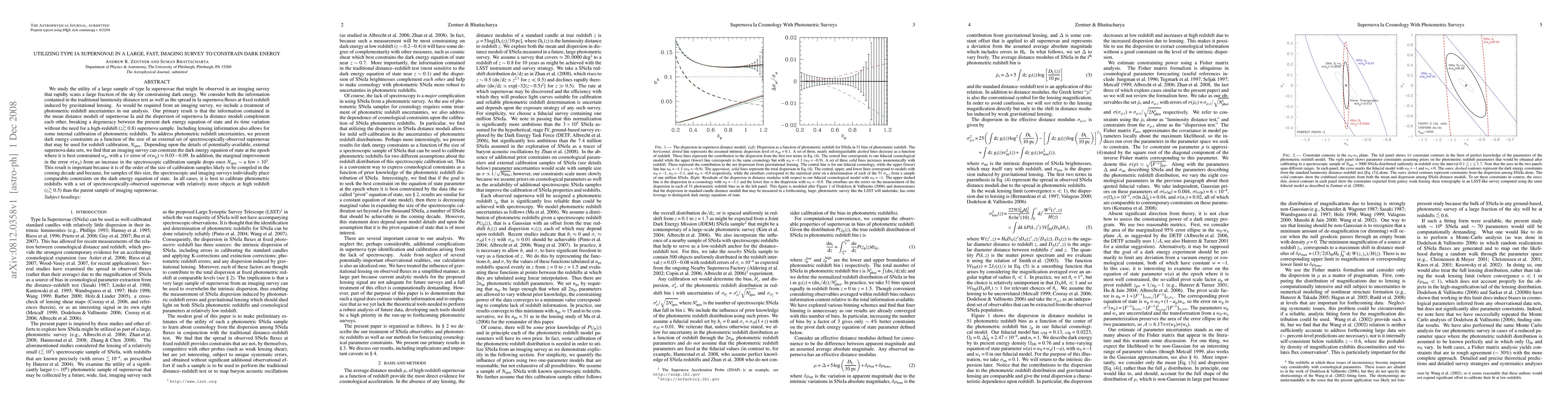 We study the utility of a large sample of type Ia supernovae that might be observed in an imaging survey that rapidly scans a large fraction of the sky for constraining dark energy. We consider information from the traditional luminosity distance test as well as the spread in SNeIa fluxes at fixed redshift induced by gravitational lensing. We include a treatment of photometric redshift uncertainties in our analysis. Our primary result is that the information contained in the mean distance moduli of SNeIa and the dispersion among SNeIa distance moduli complement each other, breaking a degeneracy between the present dark energy equation of state and its time variation without the need for a high-redshift supernova sample. To address photometric redshift uncertainties, we present dark energy constraints as a function of the size of an external set of spectroscopically-observed SNeIa that may be used for redshift calibration, nspec. We find that an imaging survey can constrain the dark energy equation of state at the epoch where it is best constrained with a 1-sigma error of sigma(wpiv)~0.03-0.09$, depending upon various assumptions. In addition, the marginal improvement in the error sigma(wpiv) from an increase in the spectroscopic calibration sample drops once nspec ~ 10^3. This result is important because it is of the order of the size of calibration samples likely to be compiled in the coming decade and because, for samples of this size, the spectroscopic and imaging surveys individually place comparable constraints on the dark energy equation of state. In all cases, it is best to calibrate photometric redshifts with a set of spectroscopically-observed SNeIa with relatively more objects at high redshift than the parent sample of imaging SNeIa.