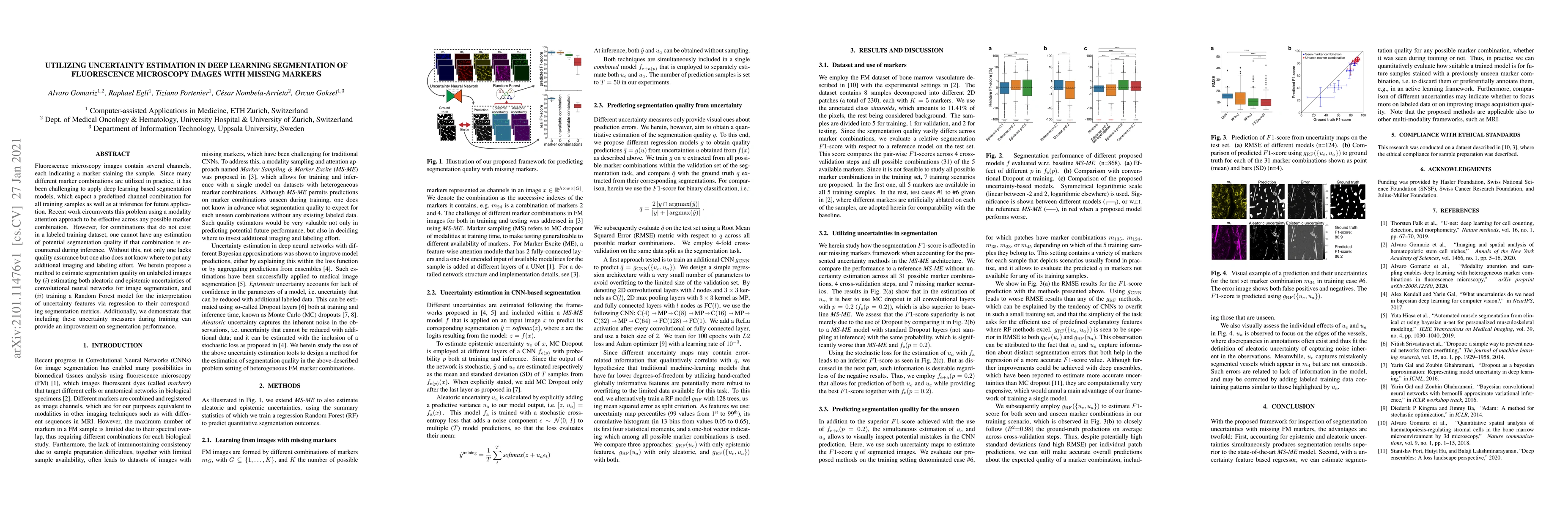 Fluorescence microscopy images contain several channels, each indicating a marker staining the sample. Since many different marker combinations are utilized in practice, it has been challenging to apply deep learning based segmentation models, which expect a predefined channel combination for all training samples as well as at inference for future application. Recent work circumvents this problem using a modality attention approach to be effective across any possible marker combination. However, for combinations that do not exist in a labeled training dataset, one cannot have any estimation of potential segmentation quality if that combination is encountered during inference. Without this, not only one lacks quality assurance but one also does not know where to put any additional imaging and labeling effort. We herein propose a method to estimate segmentation quality on unlabeled images by (i) estimating both aleatoric and epistemic uncertainties of convolutional neural networks for image segmentation, and (ii) training a Random Forest model for the interpretation of uncertainty features via regression to their corresponding segmentation metrics. Additionally, we demonstrate that including these uncertainty measures during training can provide an improvement on segmentation performance.