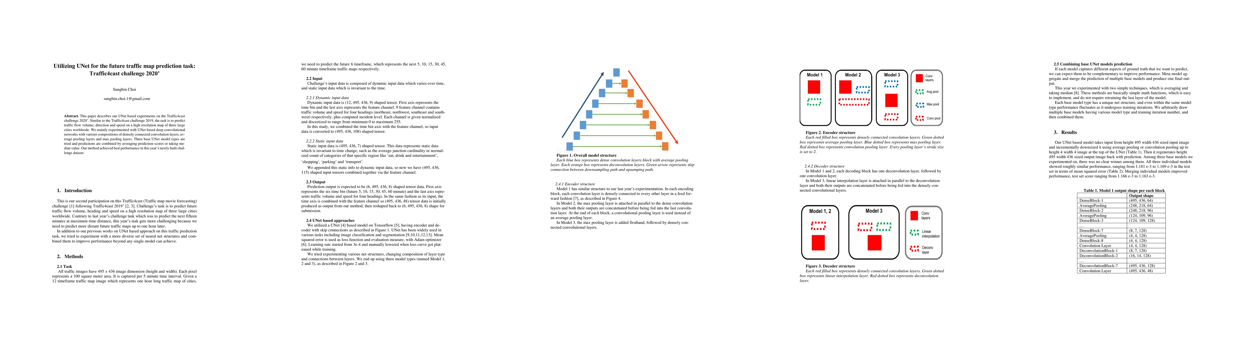 This paper describes our UNet based experiments on the Traffic4cast challenge 2020. Similar to the Traffic4cast challenge 2019, the task is to predict traffic flow volume, direction and speed on a high resolution map of three large cities worldwide. We mainly experimented with UNet based deep convolutional networks with various compositions of densely connected convolution layers, average pooling layers and max pooling layers. Three base UNet model types are tried and predictions are combined by averaging prediction scores or taking median value. Our method achieved best performance in this years newly built challenge dataset.