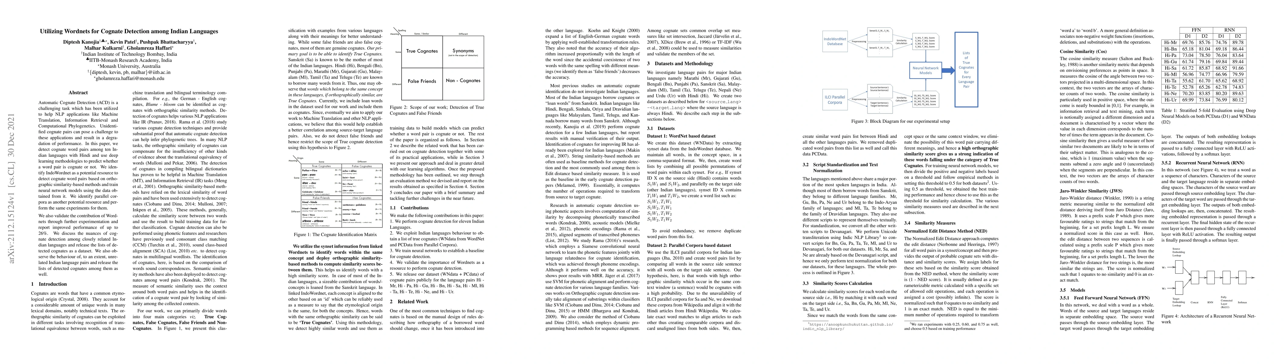 This paper utilizes deep learning and Wordnets to detect cognate word pairs among ten Indian languages, focusing on Hindi. It reports improved performance of up to 26% by leveraging IndoWordnet and parallel corpora, and releases a dataset of detected cognates.