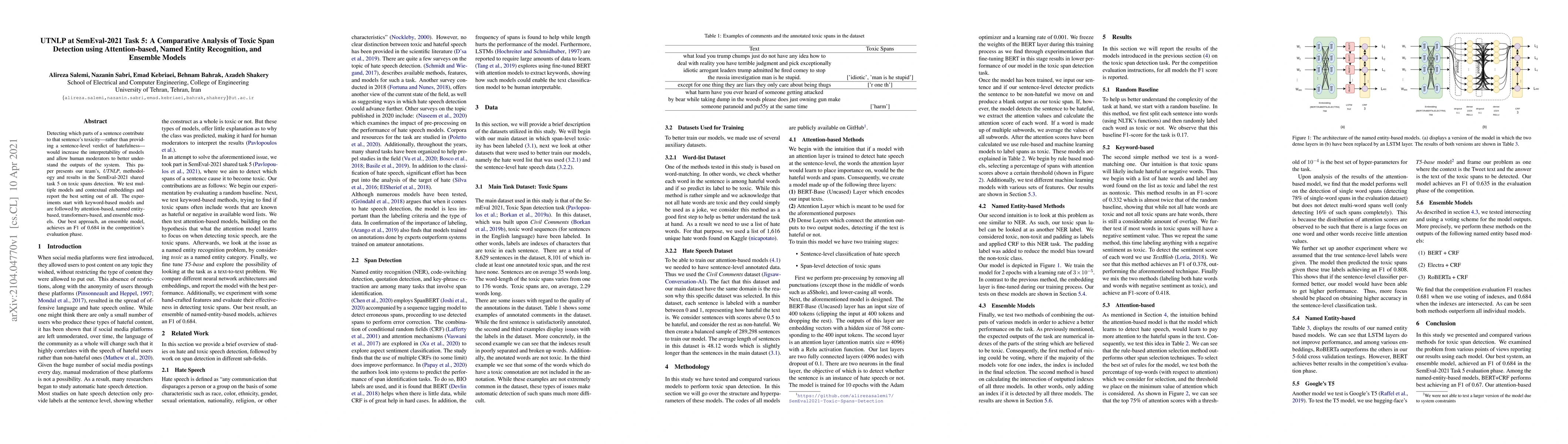 This paper from UTNLP describes a comparative analysis of various models for detecting toxic spans within sentences in the SemEval-2021 Task 5. An ensemble model combining different approaches achieves the best performance with an F1 score of 0.684, highlighting the effectiveness of combining multiple methodologies.