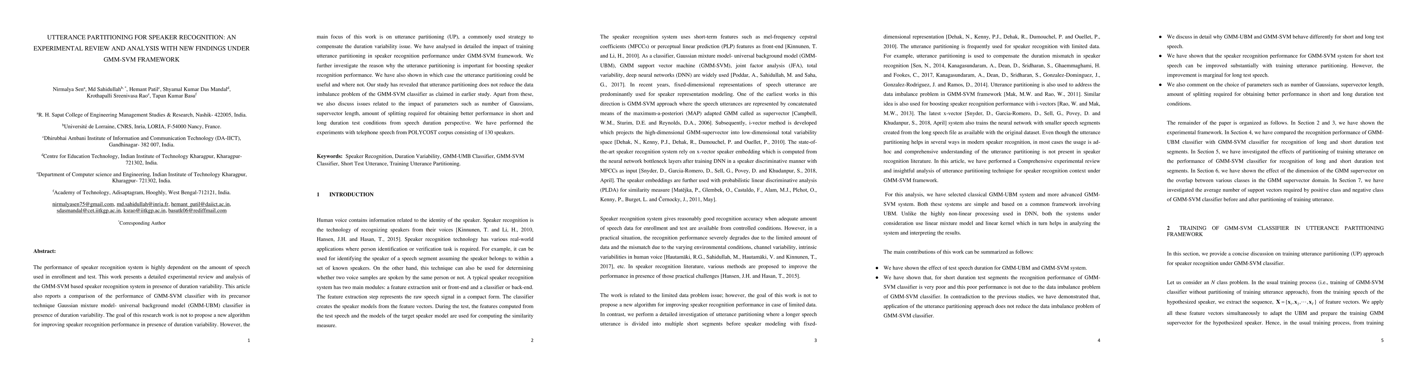 This paper reviews and analyzes the performance of GMM-SVM based speaker recognition systems in the context of duration variability, focusing on the impact of utterance partitioning. It finds that while utterance partitioning can enhance recognition performance, it does not mitigate data imbalance issues as previously suggested, and its effectiveness varies with test duration and other parameters.