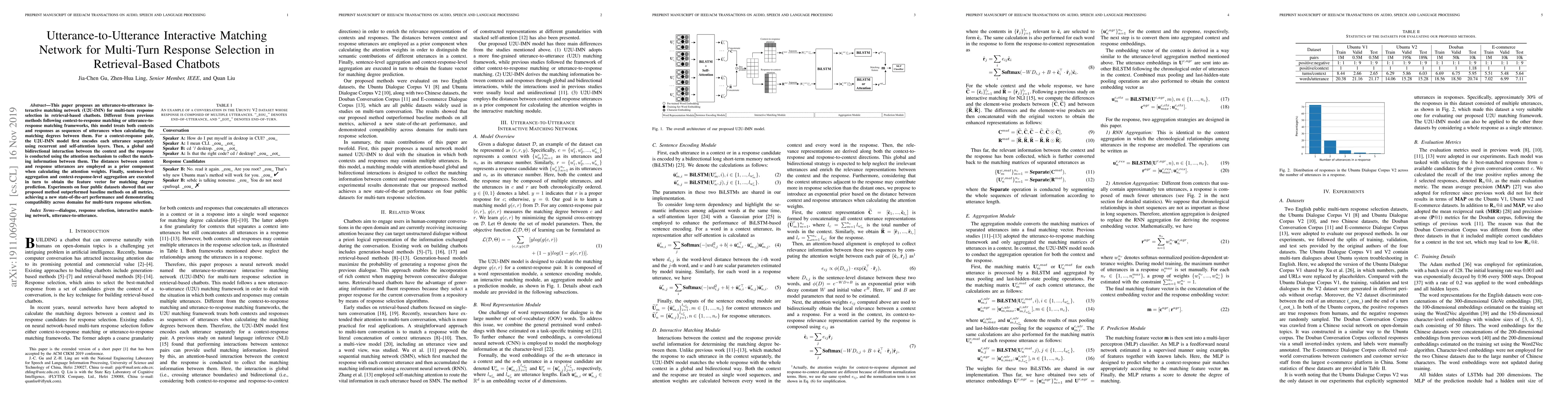 This paper introduces an utterance-to-utterance interactive matching network (U2U-IMN) for multi-turn response selection in retrieval-based chatbots, outperforming baseline methods on four datasets by encoding and matching utterances as sequences. The model uses recurrent and self-attention layers, attention mechanisms, and aggregation techniques to achieve state-of-the-art performance.