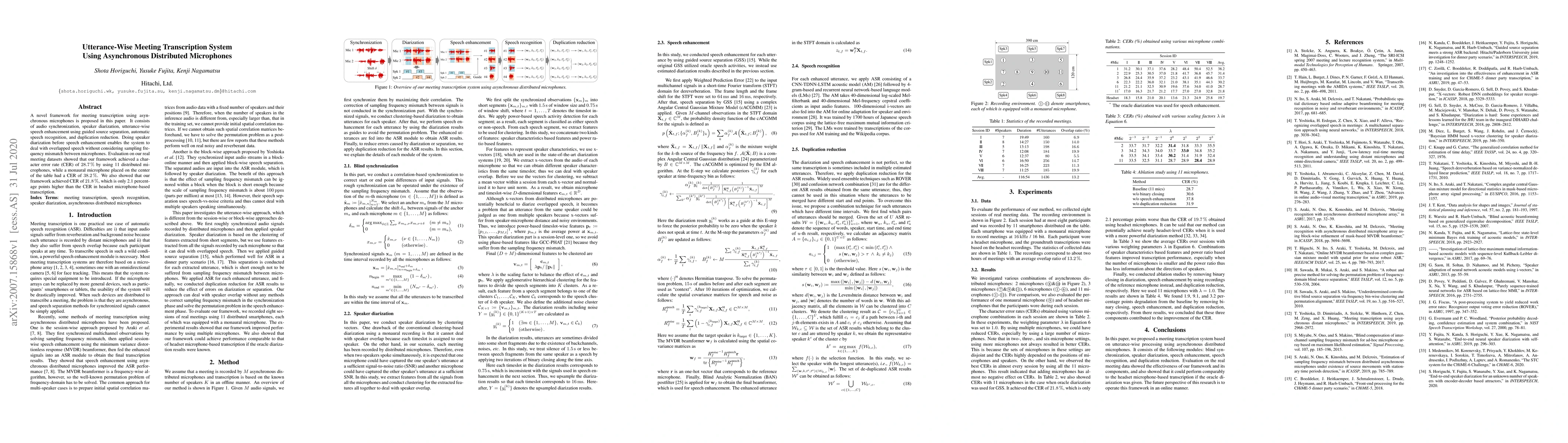 This paper proposes a novel framework for meeting transcription using asynchronous distributed microphones, achieving a character error rate of 28.7% with 11 microphones, significantly better than a monaural microphone's 38.2% CER, by employing audio synchronization, speaker diarization, and utterance-wise speech enhancement.