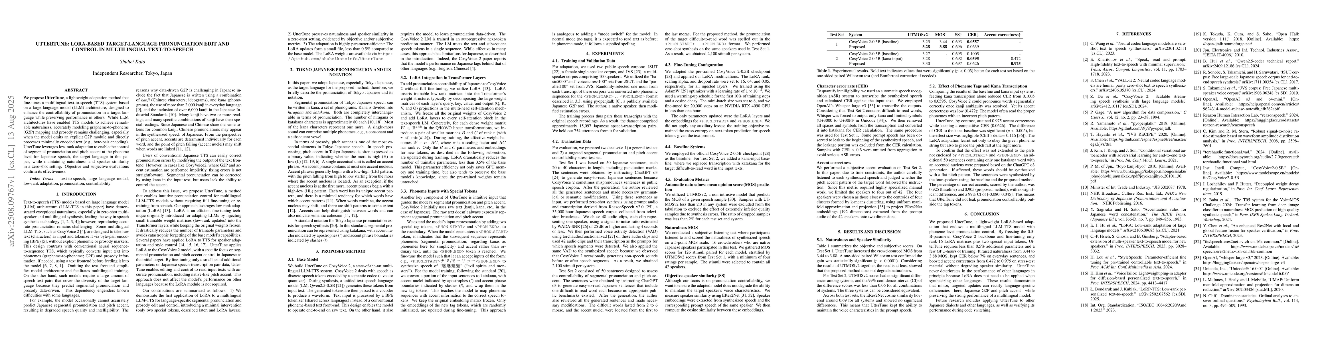 We propose UtterTune, a lightweight adaptation method that fine-tunes a multilingual text-to-speech (TTS) system based on a large language model (LLM) architecture, designed to enhance the controllability of pronunciation in a target language while preserving performance in others. While LLM architectures have enabled TTS models to achieve remarkable naturalness, accurately modeling grapheme-to-phoneme (G2P) mapping and prosody remains challenging, especially when the model omits an explicit G2P module and directly processes minimally encoded text (e.g., byte-pair encoding). UtterTune leverages low-rank adaptation to enable the control of segmental pronunciation and pitch accent at the phoneme level for Japanese speech, the target language in this paper, while maintaining naturalness and speaker similarity in a zero-shot setting. Objective and subjective evaluations confirm its effectiveness.