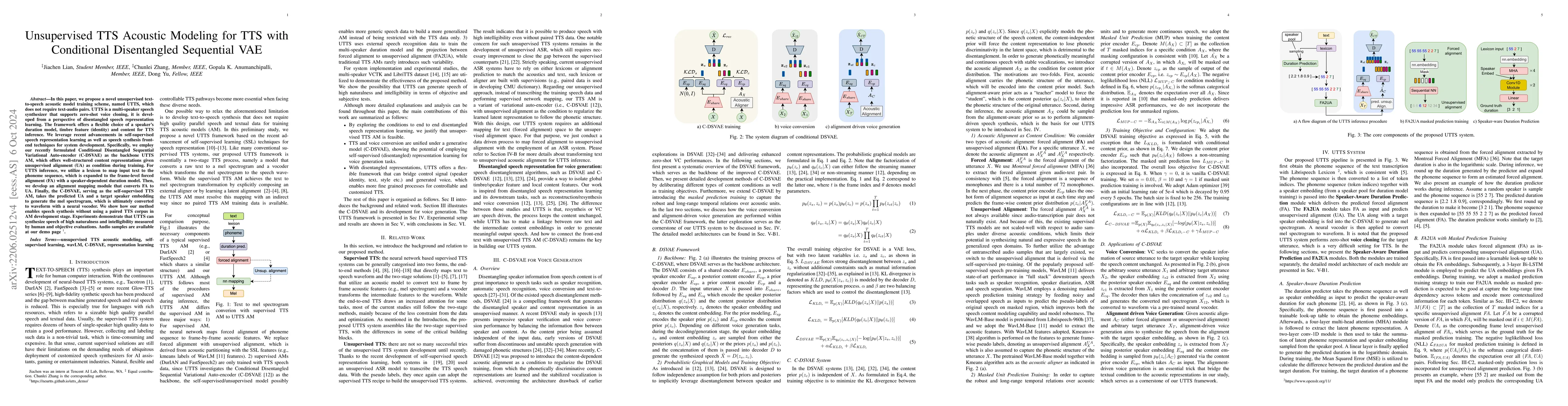 The paper proposes a novel unsupervised text-to-speech (UTTS) framework, UTTS, which does not require text-audio pairs for acoustic modeling (AM). It leverages self-supervised speech representation learning and front-end speech synthesis techniques, employing a Conditional Disentangled Sequential Variational Autoencoder (C-DSVAE) as the backbone AM. The system uses a lexicon for text-to-phoneme conversion, a speaker-dependent duration model, and an alignment mapping module for converting forced alignment to unsupervised alignment. Finally, C-DSVAE generates mel spectrograms, which are converted to waveforms using a neural vocoder.