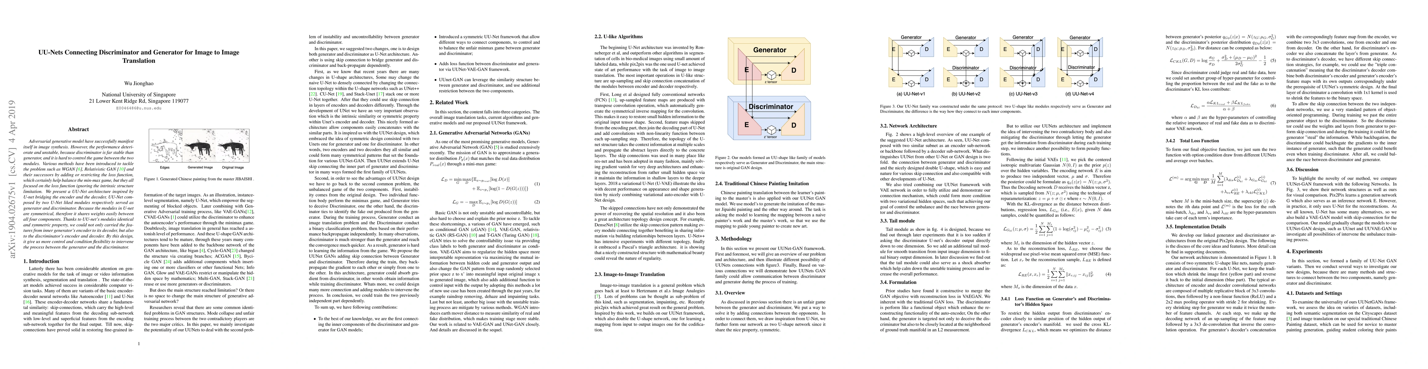 Adversarial generative model have successfully manifest itself in image synthesis. However, the performance deteriorate and unstable, because discriminator is far stable than generator, and it is hard to control the game between the two modules. Various methods have been introduced to tackle the problem such as WGAN, Relativistic GAN and their successors by adding or restricting the loss function, which certainly help balance the min-max game, but they all focused on the loss function ignoring the intrinsic structure limitation. We present a UU-Net architecture inspired by U-net bridging the encoder and the decoder, UU-Net composed by two U-Net liked modules respectively served as generator and discriminator. Because the modules in U-net are symmetrical, therefore it shares weights easily between all four components. Thanks to UU-net's modules identical and symmetric property, we could not only carried the features from inner generator's encoder to its decoder, but also to the discriminator's encoder and decoder. By this design, it give us more control and condition flexibility to intervene the process between the generator and the discriminator.