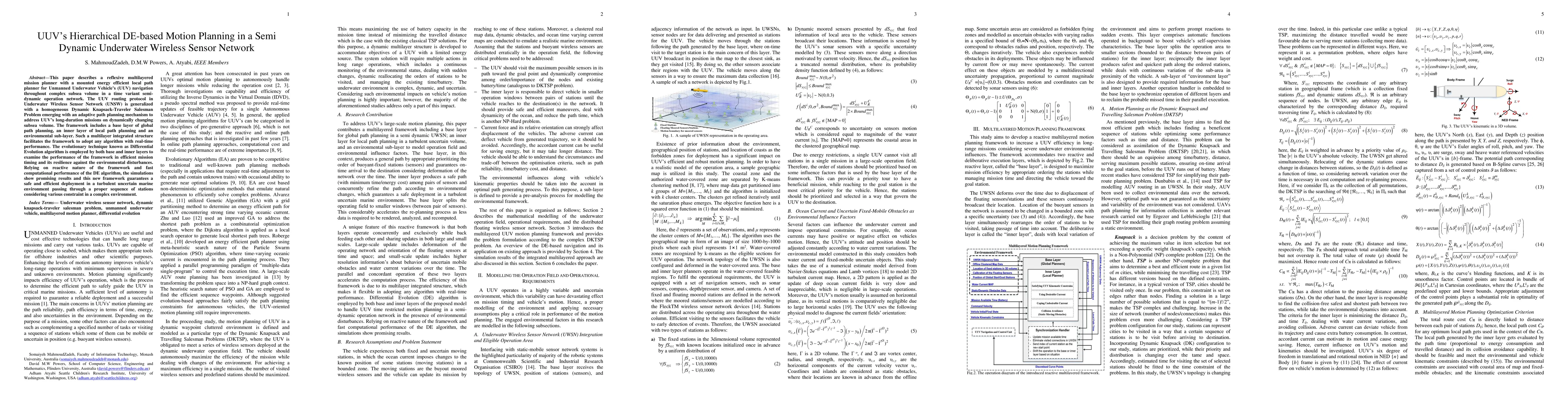 This paper presents a hierarchical motion planning framework for Unmanned Underwater Vehicles (UUVs) using Differential Evolution, integrating global and local path planning layers to navigate in a semi-dynamic underwater wireless sensor network, demonstrating efficient mission execution and resilience to environmental changes.