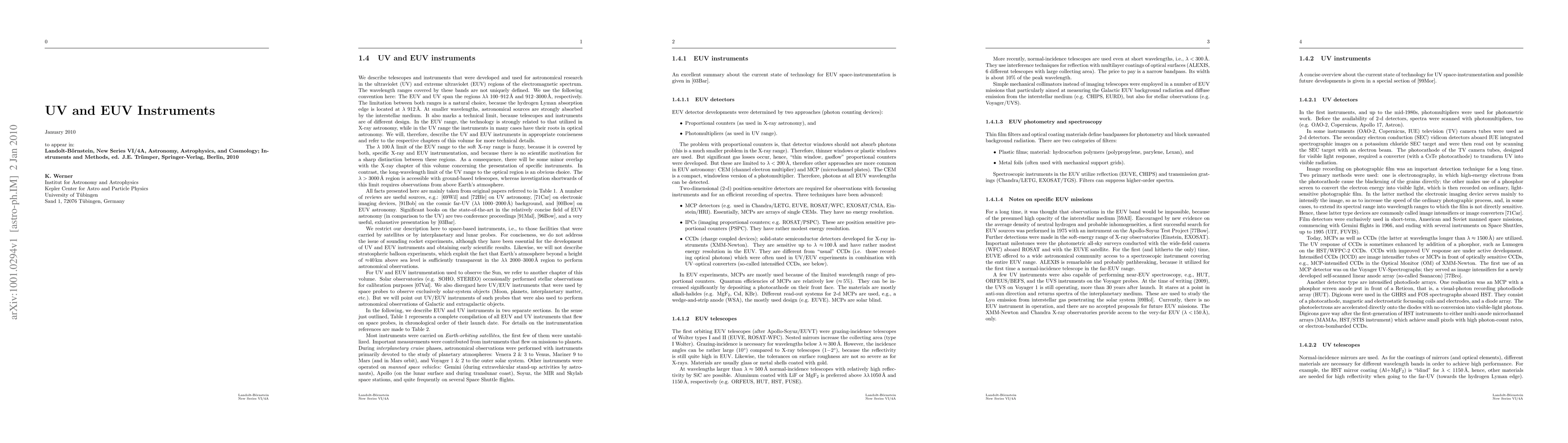We describe telescopes and instruments that were developed and used for astronomical research in the ultraviolet (UV) and extreme ultraviolet (EUV) regions of the electromagnetic spectrum. The wavelength ranges covered by these bands are not uniquely defined. We use the following convention here: The EUV and UV span the regions ~100-912 and 912-3000 Angstroem respectively. The limitation between both ranges is a natural choice, because the hydrogen Lyman absorption edge is located at 912 Angstroem. At smaller wavelengths, astronomical sources are strongly absorbed by the interstellar medium. It also marks a technical limit, because telescopes and instruments are of different design. In the EUV range, the technology is strongly related to that utilized in X-ray astronomy, while in the UV range the instruments in many cases have their roots in optical astronomy. We will, therefore, describe the UV and EUV instruments in appropriate conciseness and refer to the respective chapters of this volume for more technical details.