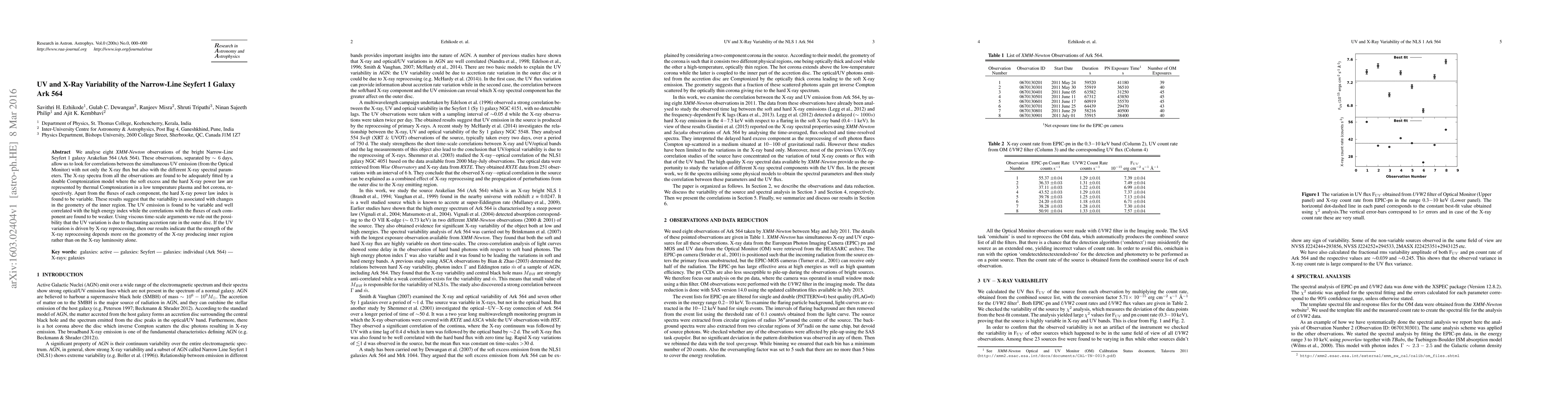 We analyse eight XMM-Newton observations of the bright Narrow-Line Seyfert 1 galaxy Arakelian 564 (Ark 564). These observations, separated by ~6 days, allow us to look for correlations between the simultaneous UV emission (from the Optical Monitor) with not only the X-ray flux but also with the different X-ray spectral parameters. The X-ray spectra from all the observations are found to be adequately fitted by a double Comptonization model where the soft excess and the hard X-ray power law are represented by thermal Comptonization in a low temperature plasma and hot corona, respectively. Apart from the fluxes of each component, the hard X-ray power law index is found to be variable. These results suggest that the variability is associated with changes in the geometry of the inner region. The UV emission is found to be variable and well correlated with the high energy index while the correlations with the fluxes of each component are found to be weaker. Using viscous time-scale arguments we rule out the possibility that the UV variation is due to fluctuating accretion rate in the outer disc. If the UV variation is driven by X-ray reprocessing, then our results indicate that the strength of the X-ray reprocessing depends more on the geometry of the X-ray producing inner region rather than on the X-ray luminosity alone.