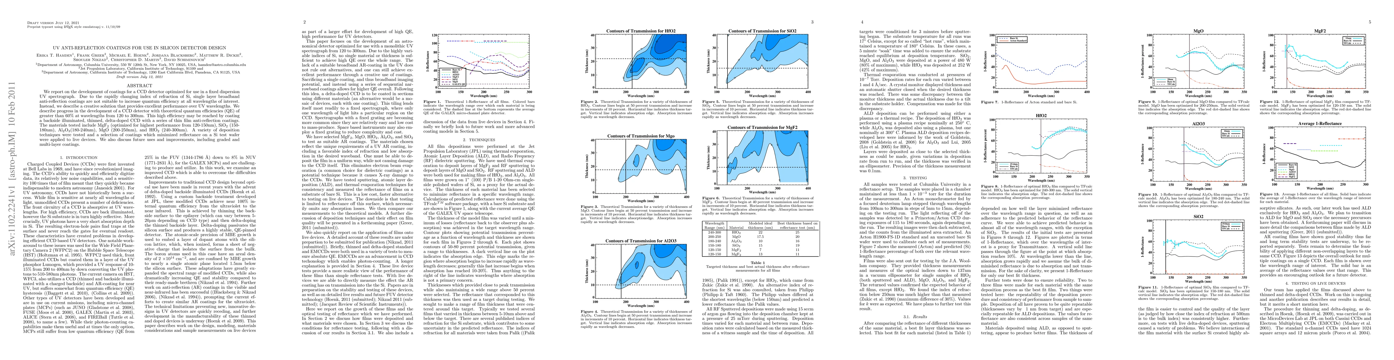 The research focuses on developing anti-reflection coatings for a CCD detector optimized for a fixed dispersion UV spectrograph. Various materials (MgF2, SiO2, Al2O3, MgO, HfO2) and deposition techniques were tested to minimize reflectance on silicon test wafers.
