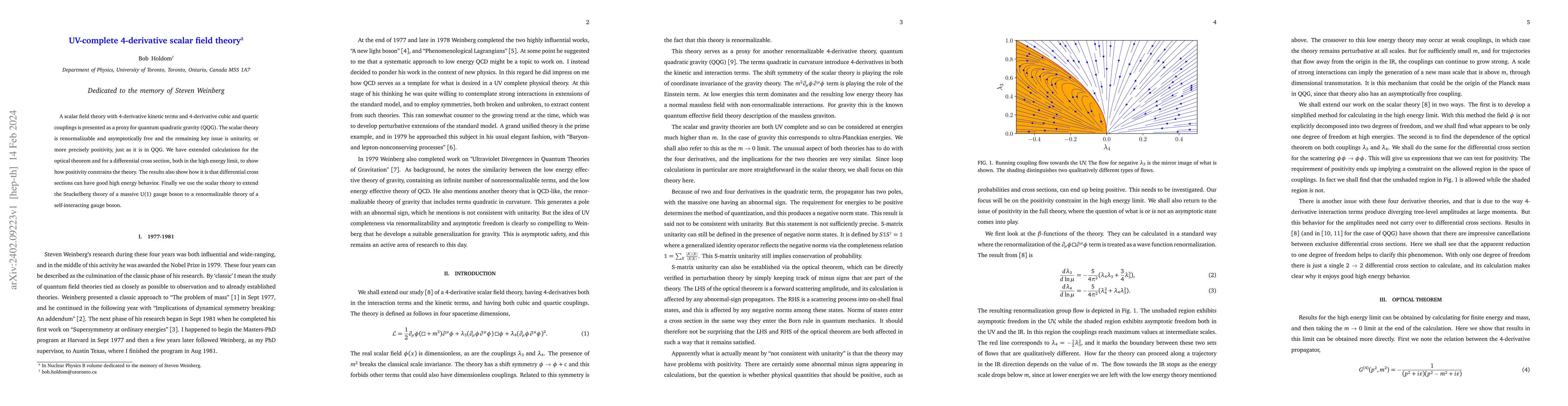 A scalar field theory with 4-derivative kinetic terms and 4-derivative cubic and quartic couplings is presented as a proxy for quantum quadratic gravity (QQG). The scalar theory is renormalizable and asymptotically free and the remaining key issue is unitarity, or more precisely positivity, just as it is in QQG. We have extended calculations for the optical theorem and for a differential cross section, both in the high energy limit, to show how positivity constrains the theory. The results also show how it is that differential cross sections can have good high energy behavior. Finally we use the scalar theory to extend the Stuckelberg theory of a massive U(1) gauge boson to a renormalizable theory of a self-interacting gauge boson.