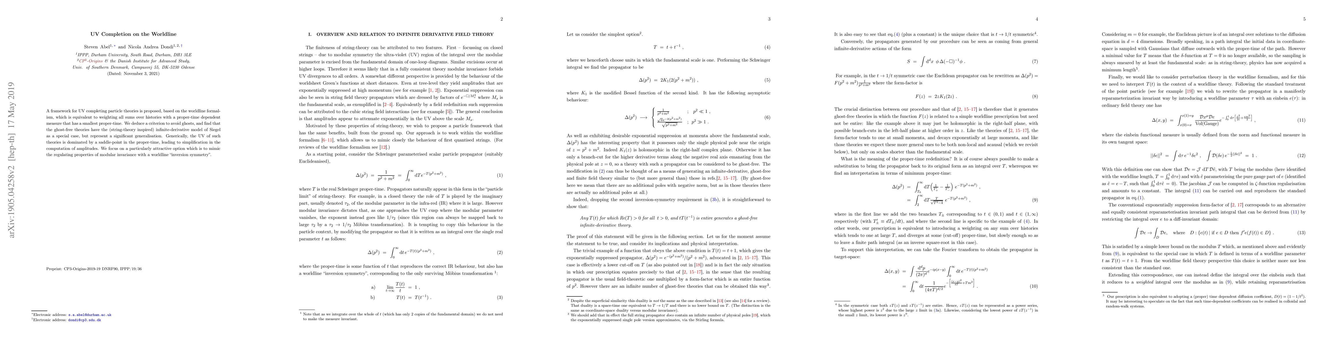 A framework for UV completing particle theories is proposed, based on the worldline formalism, which is equivalent to weighting all sums over histories with a proper-time dependent measure that has a smallest proper-time. We deduce a criterion to avoid ghosts, and find that the ghost-free theories have the (string-theory inspired) infinite-derivative model of Siegel as a special case, but represent a significant generalisation. Generically, the UV of such theories is dominated by a saddle-point in the proper-time, leading to simplification in the computation of amplitudes. We focus on a particularly attractive option which is to mimic the regulating properties of modular invariance with a worldline "inversion symmetry".
