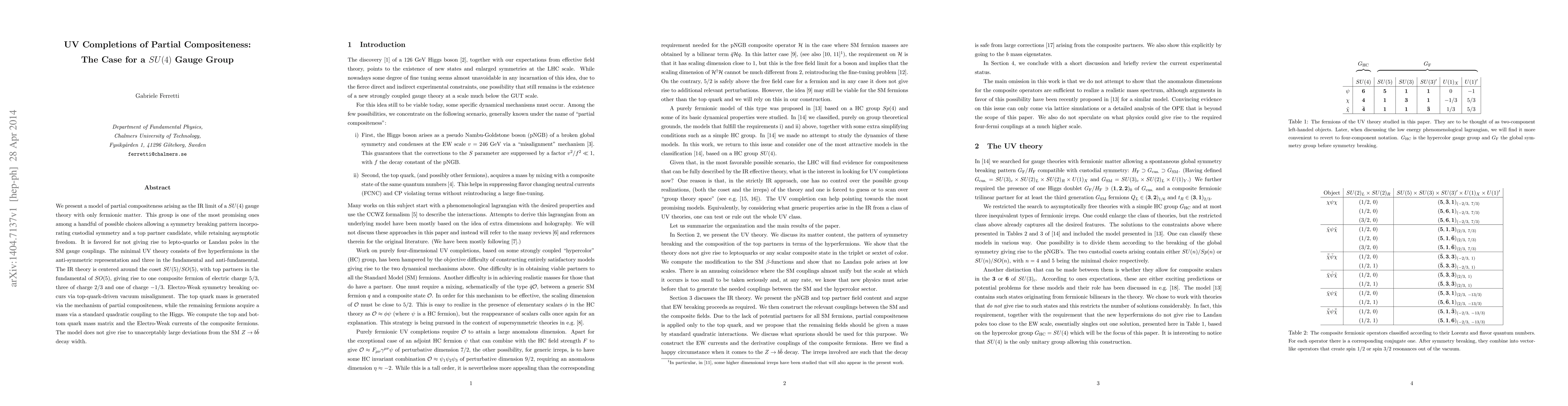 We present a model of partial compositeness arising as the IR limit of a SU(4) gauge theory with only fermionic matter. This group is one of the most promising ones among a handful of possible choices allowing a symmetry breaking pattern incorporating custodial symmetry and a top partner candidate, while retaining asymptotic freedom. It is favored for not giving rise to lepto-quarks or Landau poles in the SM gauge couplings. The minimal UV theory consists of five hyperfermions in the anti-symmetric representation and three in the fundamental and anti-fundamental. The IR theory is centered around the coset SU(5)/SO(5), with top partners in the fundamental of SO(5), giving rise to one composite fermion of electric charge 5/3, three of charge 2/3 and one of charge -1/3. Electro-Weak symmetry breaking occurs via top-quark-driven vacuum misalignment. The top quark mass is generated via the mechanism of partial compositeness, while the remaining fermions acquire a mass via a standard quadratic coupling to the Higgs. We compute the top and bottom quark mass matrix and the Electro-Weak currents of the composite fermions. The model does not give rise to unacceptably large deviations from the SM Z\to b \bar b decay width.