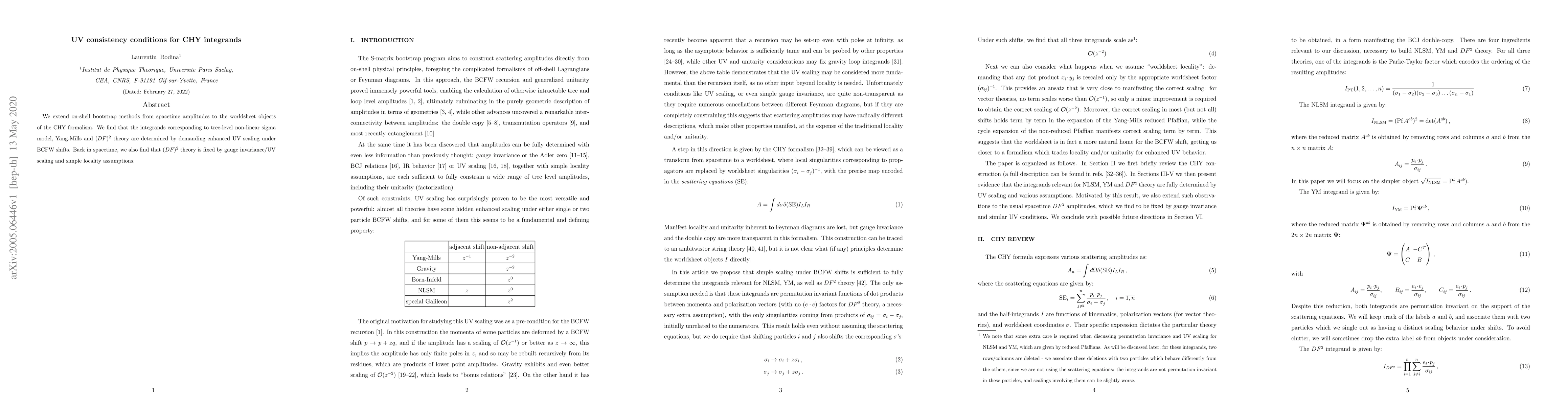 We extend on-shell bootstrap methods from spacetime amplitudes to the worldsheet objects of the CHY formalism. We find that the integrands corresponding to tree-level non-linear sigma model, Yang-Mills and $(DF)^2$ theory are determined by demanding enhanced UV scaling under BCFW shifts. Back in spacetime, we also find that $(DF)^2$ theory is fixed by gauge invariance/UV scaling and simple locality assumptions.