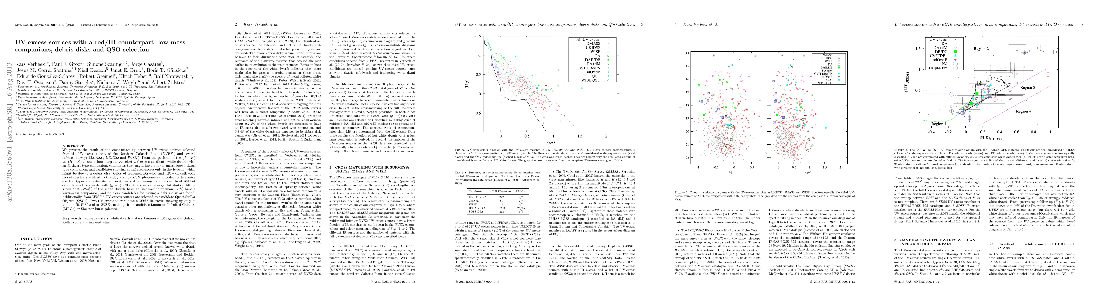 This study cross-matches UV-excess sources from the UVEX survey with infrared data, identifying white dwarfs with M-dwarf or brown-dwarf companions and debris disk candidates. It finds that 2-4% of white dwarfs have low-mass companions, while no clear debris disk candidates are detected. Additionally, 6 sources are selected as potential QSOs, with 2 showing mid-IR excess indicative of LIRGs or starburst galaxies.
