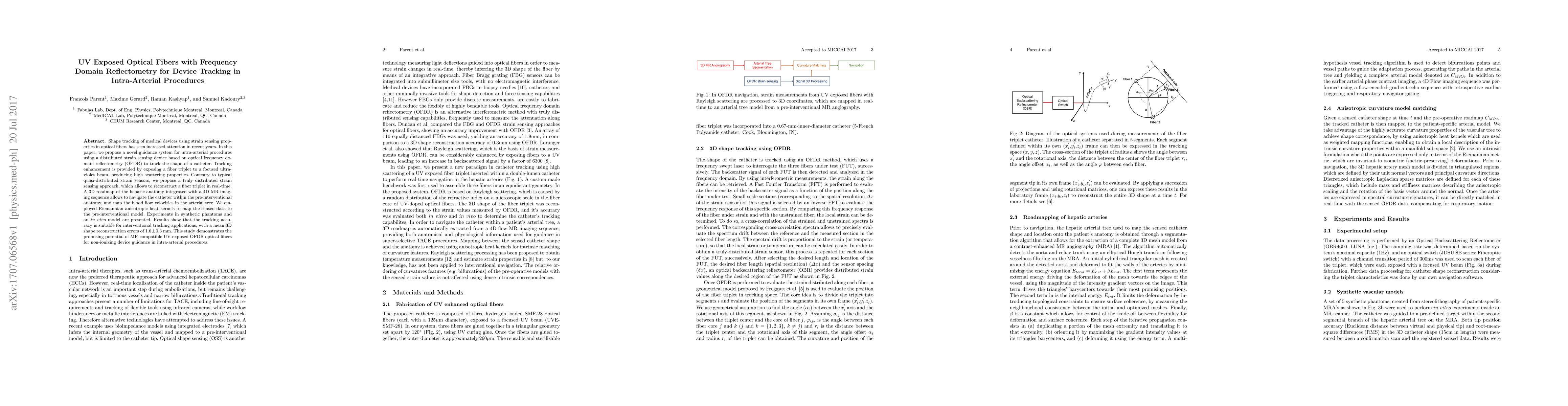 This paper proposes a novel guidance system using UV-exposed optical fibers with optical frequency domain reflectometry (OFDR) for real-time tracking of catheters in intra-arterial procedures. The method enhances tracking accuracy through high scattering properties and provides a 3D roadmap for navigation, demonstrating promising potential for non-ionizing device guidance.