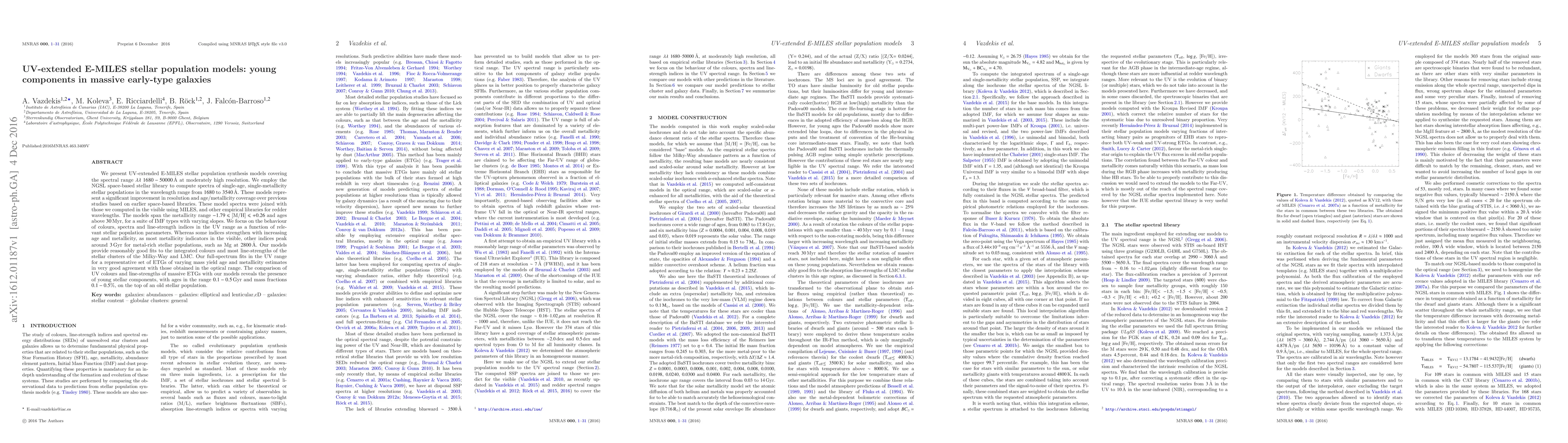 This paper introduces UV-extended E-MILES stellar population models that significantly improve resolution and coverage over previous studies. The models reveal young stellar components in massive early-type galaxies, with ages ranging from 0.1 to 0.5 Gyr, overlaying older populations, based on UV spectral analysis.