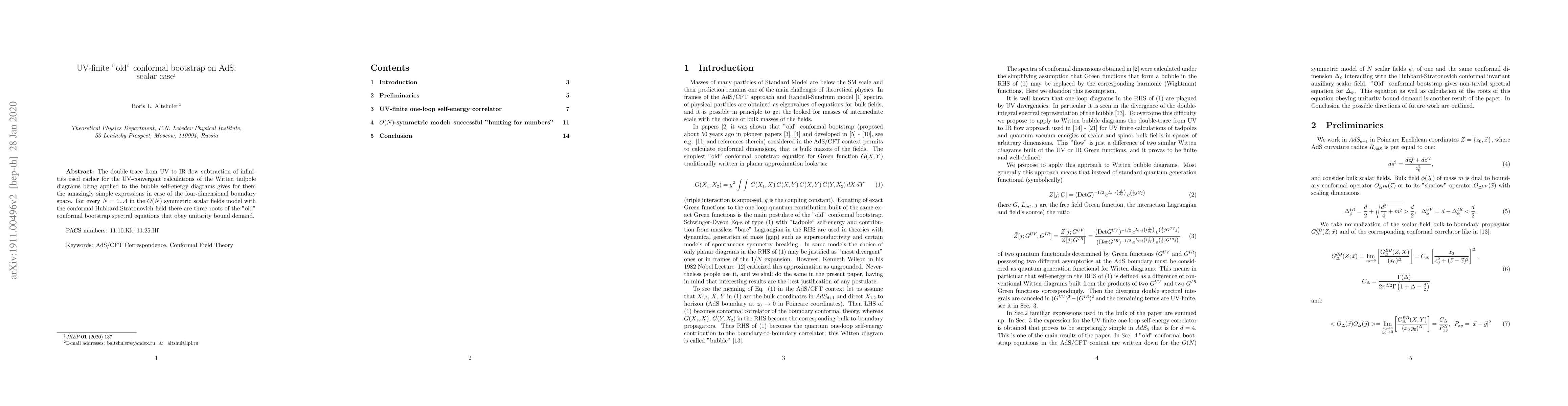 This paper explores the UV-finite conformal bootstrap method applied to the bubble self-energy diagrams in four-dimensional boundary space, revealing simple expressions for the $O(N)$ symmetric scalar fields model. It identifies three roots of the "old" conformal bootstrap spectral equations that satisfy unitarity constraints.