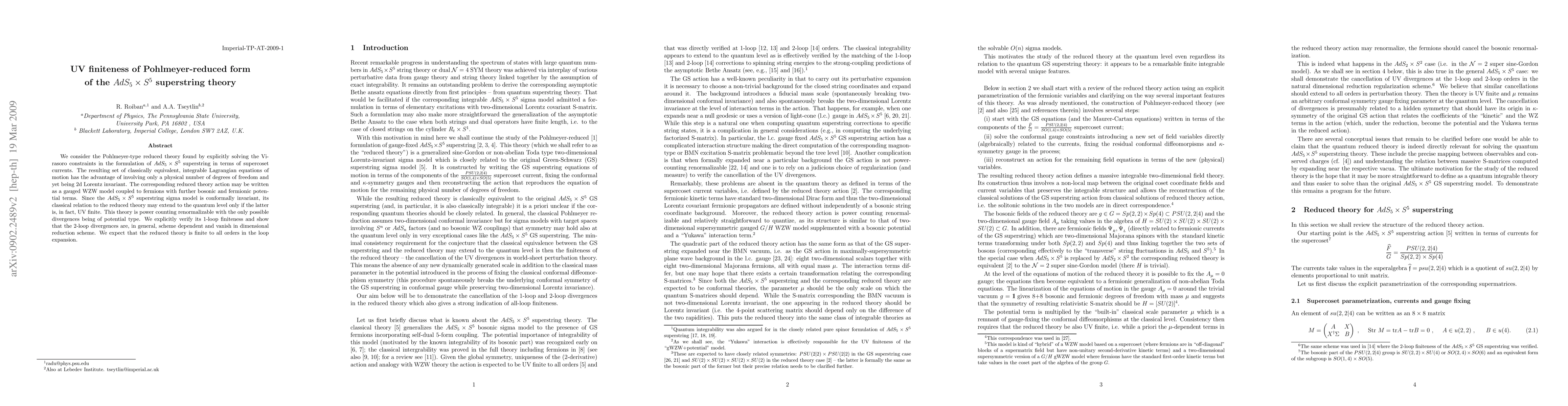 We consider the Pohlmeyer-type reduced theory found by explicitly solving the Virasoro constraints in the formulation of AdS_5xS^5 superstring in terms of supercoset currents. The resulting set of classically equivalent, integrable Lagrangian equations of motion has the advantage of involving only a physical number of degrees of freedom and yet being 2d Lorentz invariant. The corresponding reduced theory action may be written as a gauged WZW model coupled to fermions with further bosonic and fermionic potential terms. Since the AdS_5xS^5 superstring sigma model is conformally invariant, its classical relation to the reduced theory may extend to the quantum level only if the latter is, in fact, UV finite. This theory is power counting renormalizable with the only possible divergences being of potential type. We explicitly verify its 1-loop finiteness and show that the 2-loop divergences are, in general, scheme dependent and vanish in dimensional reduction scheme. We expect that the reduced theory is finite to all orders in the loop expansion.