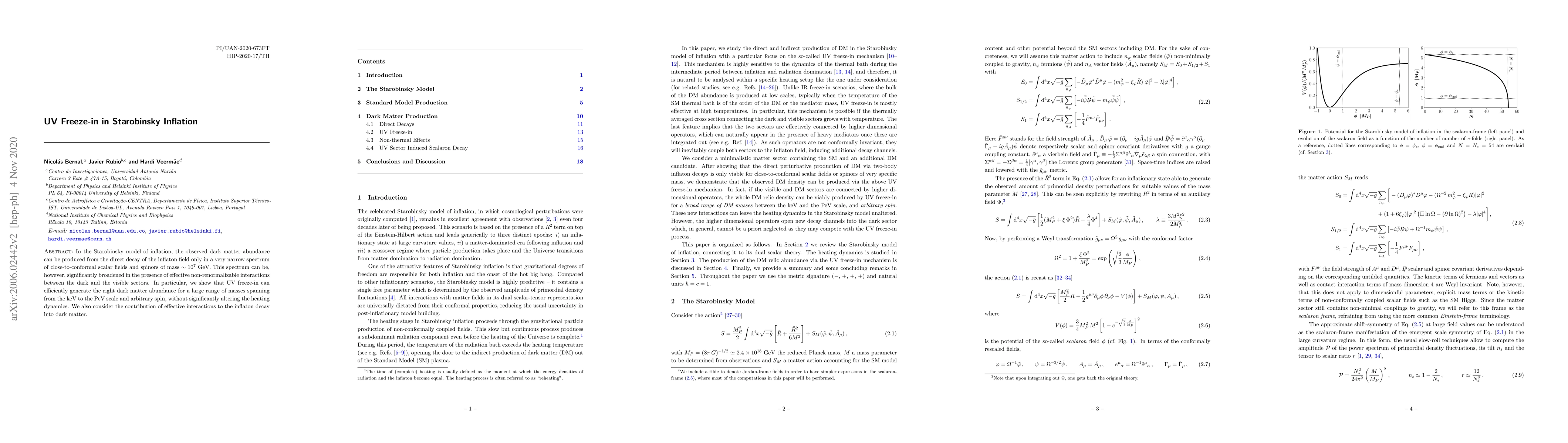 In the Starobinsky model of inflation, the observed dark matter abundance can be produced from the direct decay of the inflaton field only in a very narrow spectrum of close-to-conformal scalar fields and spinors of mass $\sim 10^7$ GeV. This spectrum can be, however, significantly broadened in the presence of effective non-renormalizable interactions between the dark and the visible sectors. In particular, we show that UV freeze-in can efficiently generate the right dark matter abundance for a large range of masses spanning from the keV to the PeV scale and arbitrary spin, without significantly altering the heating dynamics. We also consider the contribution of effective interactions to the inflaton decay into dark matter.