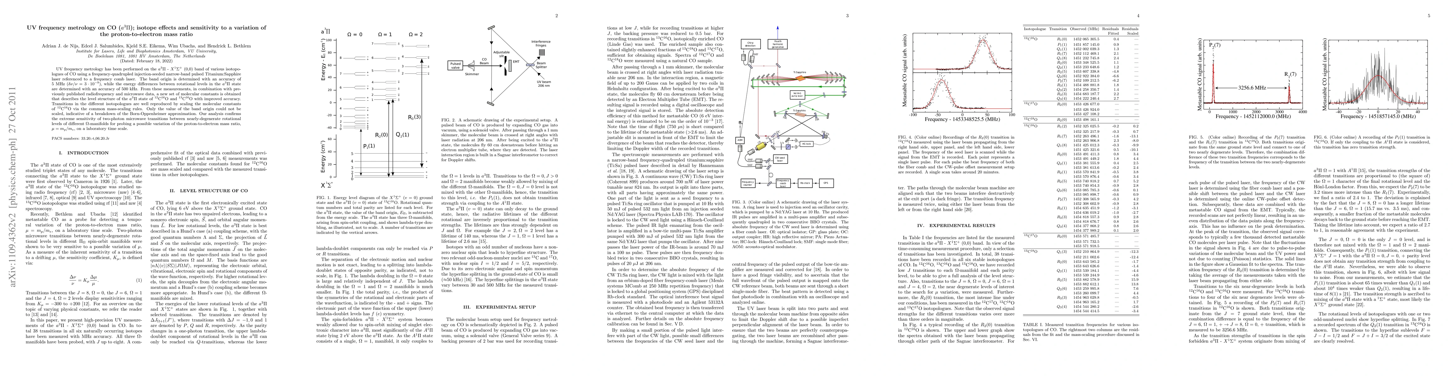 This paper reports high-precision UV frequency metrology on CO isotopologues, revealing improved molecular constants for the a3Pi state and confirming the sensitivity of two-photon microwave transitions to variations in the proton-to-electron mass ratio.