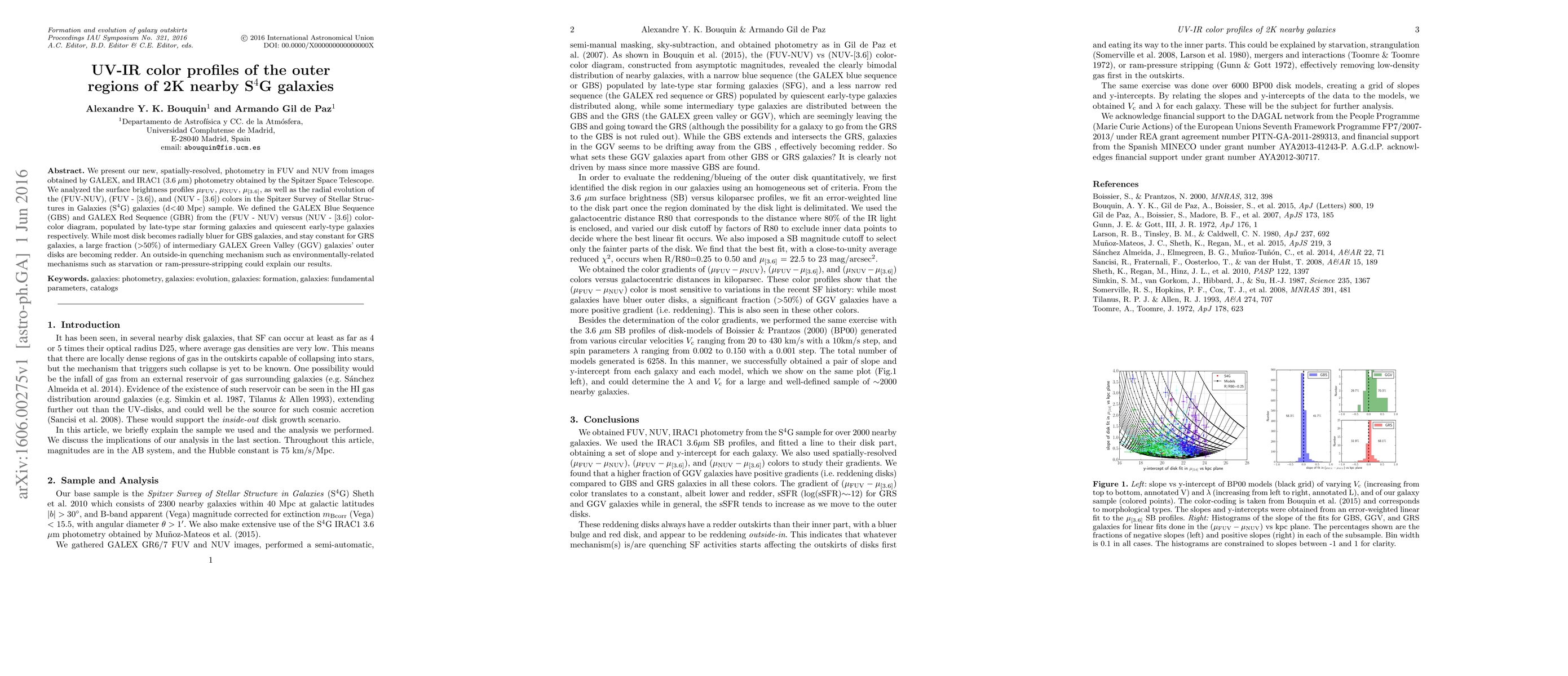 We present our new, spatially-resolved, photometry in FUV and NUV from images obtained by GALEX, and IRAC1 (3.6 $\mu$m) photometry obtained by the Spitzer Space Telescope. We analyzed the surface brightness profiles $\mu_{\rm{FUV}}$, $\mu_{\rm{NUV}}$, $\mu_{[3.6]}$, as well as the radial evolution of the (FUV-NUV), (FUV - [3.6]), and (NUV - [3.6]) colors in the Spitzer Survey of Stellar Structures in Galaxies (S$^{4}$G) galaxies (d$<$40 Mpc) sample. We defined the GALEX Blue Sequence (GBS) and GALEX Red Sequence (GBR) from the (FUV - NUV) versus (NUV - [3.6]) color-color diagram, populated by late-type star forming galaxies and quiescent early-type galaxies respectively. While most disk becomes radially bluer for GBS galaxies, and stay constant for GRS galaxies, a large fraction ($>$50%) of intermediary GALEX Green Valley (GGV) galaxies' outer disks are becoming redder. An outside-in quenching mechanism such as environmentally-related mechanisms such as starvation or ram-pressure-stripping could explain our results.