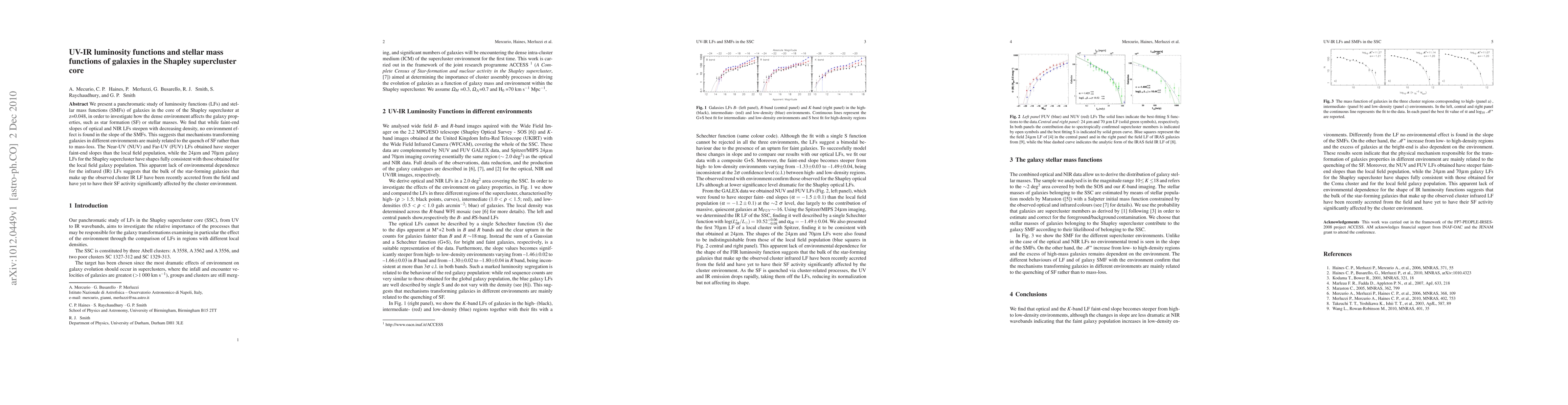 This study examines the UV-IR luminosity and stellar mass functions of galaxies in the Shapley supercluster core, finding that while optical and NIR LFs steepen in denser environments, the SMFs remain unaffected. The UV LFs show steeper faint-end slopes compared to local field galaxies, indicating different transformation mechanisms related to star formation quenching rather than mass-loss.