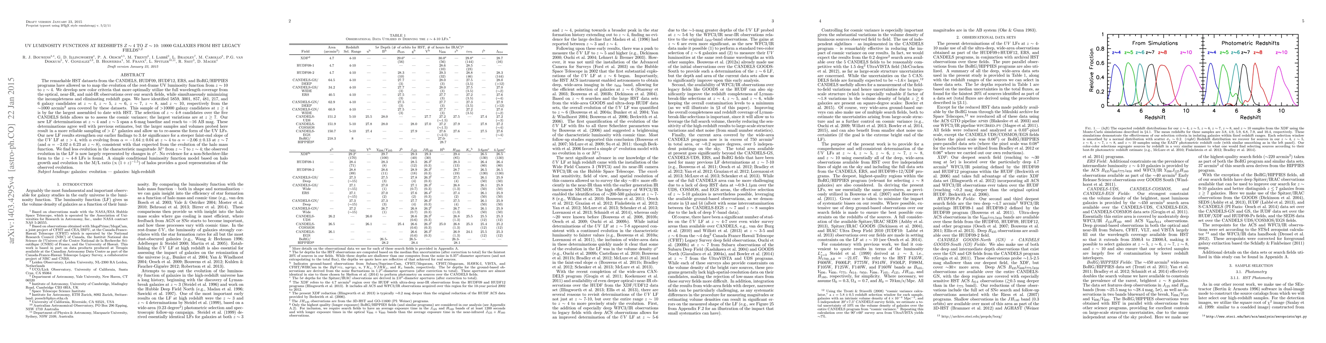 This paper analyzes the UV luminosity functions (LFs) from z~4 to z~10 using HST data from CANDELS, HUDF, and other legacy fields, identifying thousands of galaxy candidates. The study finds a steeper faint-end slope in the UV LFs at higher redshifts and less evolution in characteristic luminosity, suggesting changes primarily in galaxy density.