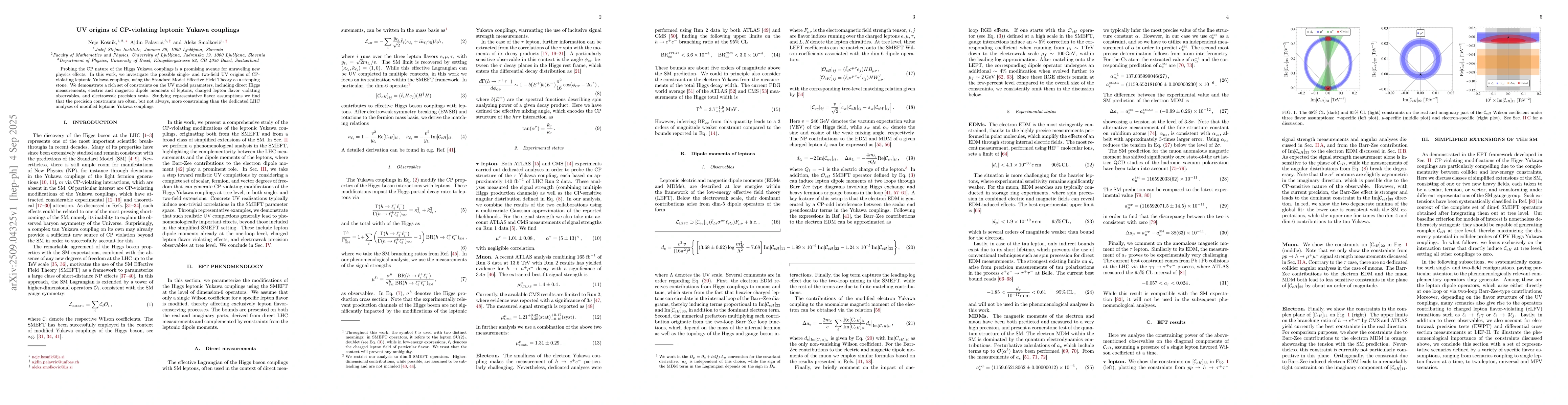Probing the CP nature of the Higgs Yukawa couplings is a promising avenue for unraveling new physics effects. In this work, we investigate the possible single- and two-field UV origins of CP-violating leptonic Yukawa couplings, using the Standard Model Effective Field Theory as a stepping stone. We demonstrate a rich set of constraints on the UV model parameters, including direct Higgs measurements, electric and magnetic dipole moments of leptons, charged lepton flavor violating observables, and electroweak precision tests. Studying representative flavor assumptions we find that the precision constraints are often, but not always, more constraining than the dedicated LHC analyses of modified leptonic Yukawa couplings.