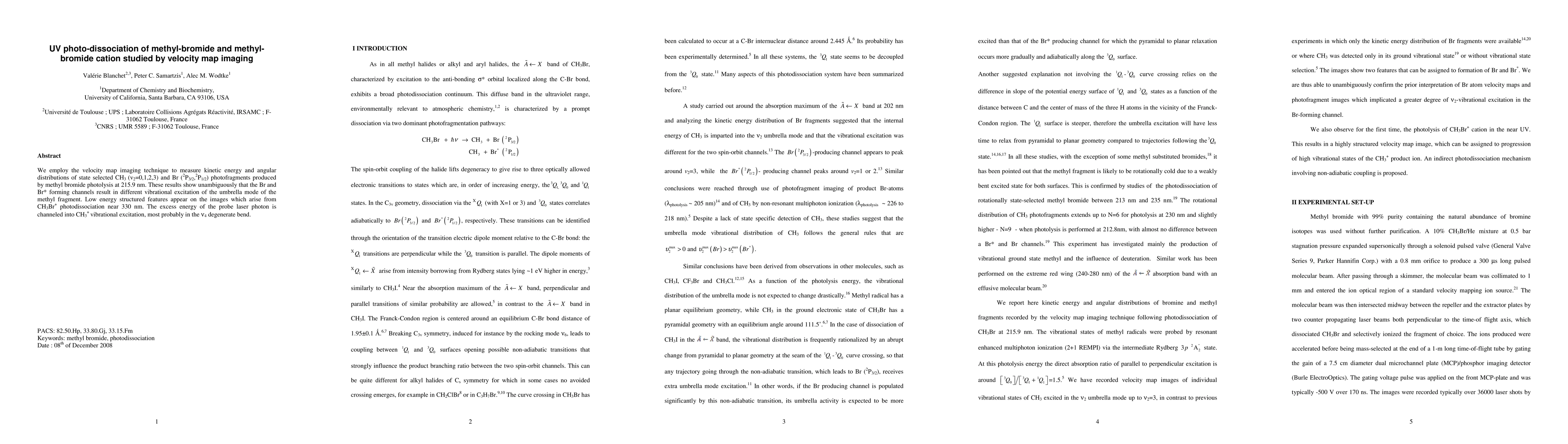 This study uses velocity map imaging to analyze the photodissociation of methyl bromide at 215.9 nm, revealing distinct vibrational excitation patterns in the methyl fragment from Br and Br* forming channels. Additionally, it identifies structured features from methyl bromide cation photodissociation at 330 nm, indicating significant vibrational excitation in the CH3+ molecule, likely in the nu_4 bend mode.