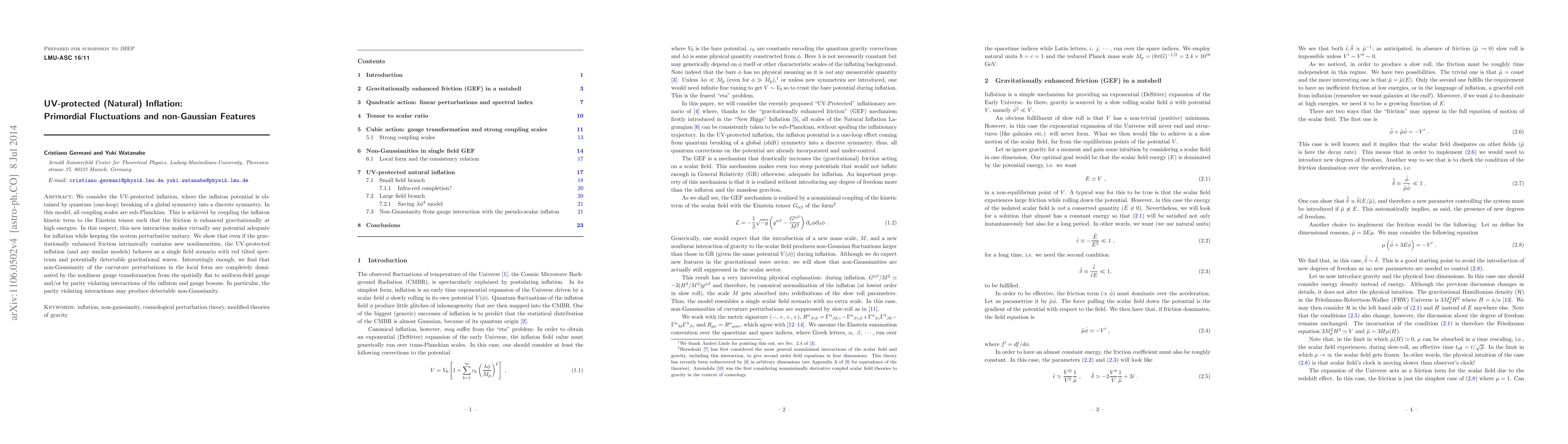 This paper explores UV-protected inflation models where the inflaton potential is derived from quantum symmetry breaking, maintaining sub-Planckian coupling scales. It demonstrates that such models can produce a red-tilted spectrum and potentially detectable gravitational waves, while non-Gaussian features in curvature perturbations are mainly due to nonlinear gauge transformations or parity-violating interactions.