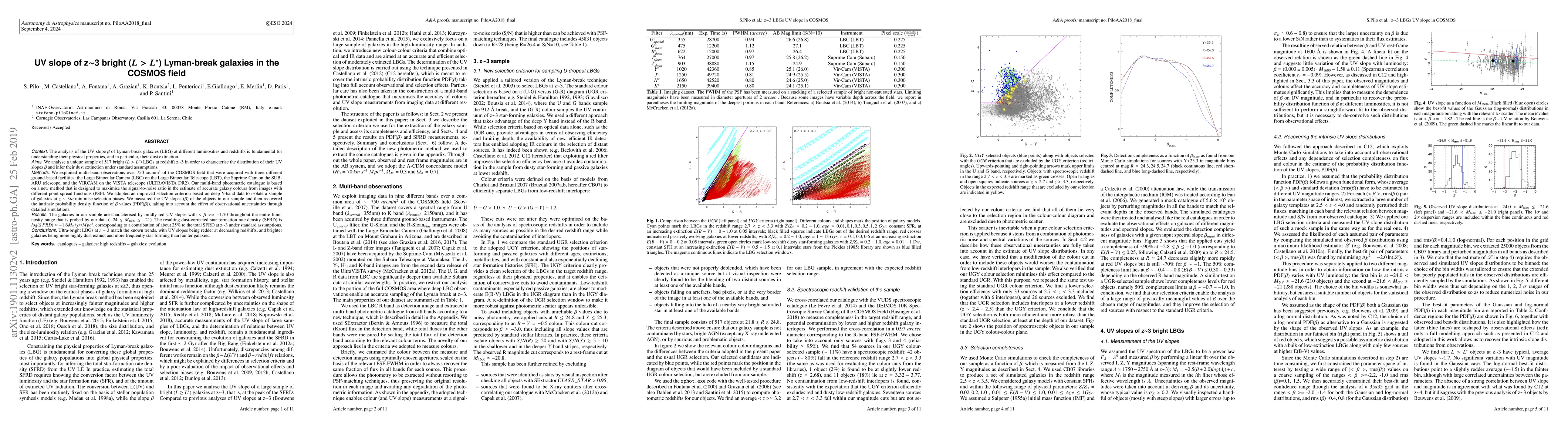 We analyse a unique sample of 517 bright ($L>L^{*}$) LBGs at redshift z$\sim$3 in order to characterise the distribution of their UV slopes $\beta$ and infer their dust extinction under standard assumptions. We exploited multi-band observations over 750 arcmin$^2$ of the COSMOS field that were acquired with three different ground-based facilities: the Large Binocular Camera (LBC) on the Large Binocular Telescope (LBT), the Suprime-Cam on the SUBARU telescope, and the VIRCAM on the VISTA telescope (ULTRAVISTA DR2). Our multi-band photometric catalogue is based on a new method that is designed to maximise the signal-to-noise ratio in the estimate of accurate galaxy colours from images with different point spread functions (PSF). We adopted an improved selection criterion based on deep Y-band data to isolate a sample of galaxies at $z\sim 3 $ to minimise selection biases. We measured the UV slopes ($\beta$) of the objects in our sample and then recovered the intrinsic probability density function of $\beta$ values (PDF($\beta$)), taking into account the effect of observational uncertainties through detailed simulations. The galaxies in our sample are characterised by mildly red UV slopes with $<\beta>\simeq -1.70$ throughout the enitre luminosity range that is probed by our data ($-24\lesssim M_{1600}\lesssim -21$). The resulting dust-corrected star formation rate density (SFRD) is $log(SFRD)\simeq-1.6 M_{\odot}/yr/Mpc^{3}$, corresponding to a contribution of about 25% to the total SFRD at z$\sim$3 under standard assumptions. Ultra-bright LBGs at $z \sim 3$ match the known trends, with UV slopes being redder at decreasing redshifts, and brighter galaxies being more highly dust extinct and more frequently star-forming than fainter galaxies. [abridged]