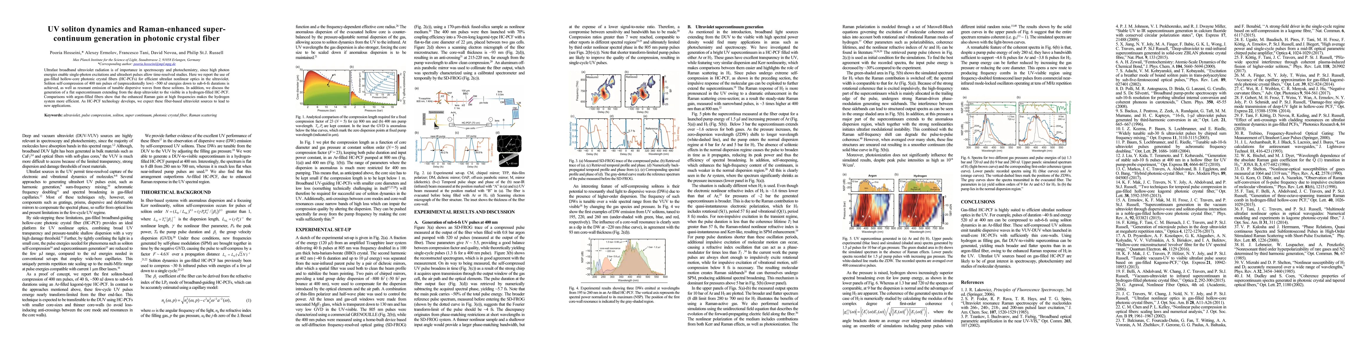 This paper reports on the use of gas-filled hollow-core photonic crystal fibers to achieve soliton self-compression of 400 nm pulses to sub-6-fs durations, and the generation of a flat supercontinuum extending from deep ultraviolet to visible, with hydrogen-filled fibers showing enhanced Raman gain efficiency.