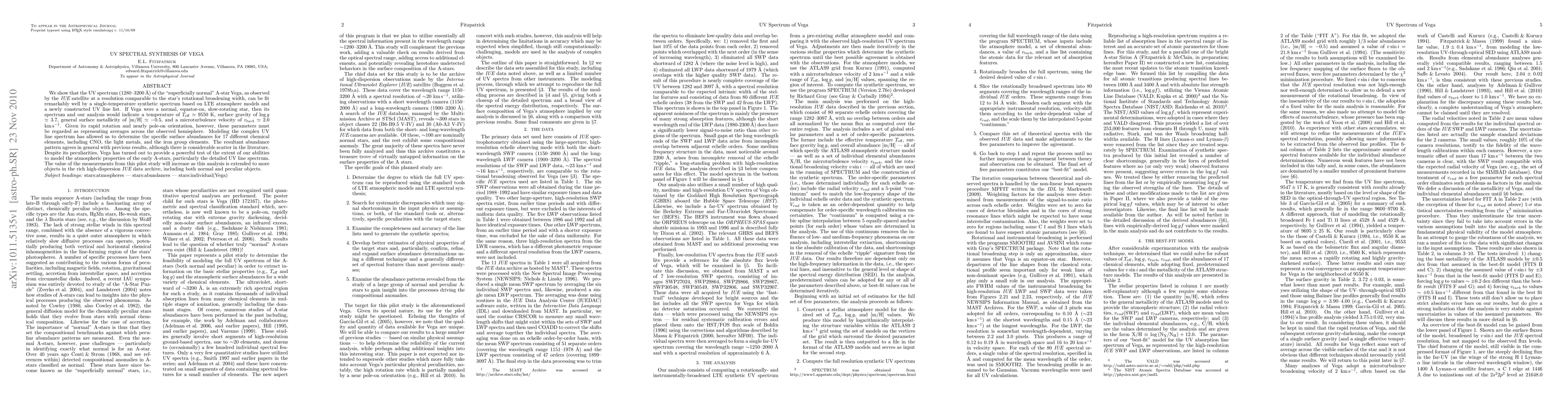 We show that the UV spectrum (1280-3200 A) of the "superficially normal" A-star Vega, as observed by the IUE satellite at a resolution comparable to the star's rotational broadening width, can be fit remarkably well by a single-temperature synthetic spectrum based on LTE atmosphere models and a newly constructed UV line list. If Vega were a normal, equator-on, slow-rotating star, then its spectrum and our analysis would indicate a temperature of Teff ~ 9550 K, surface gravity of log g ~ 3.7, general surface metallicity of [m/H] ~ -0.5, and a microturbulence velocity of v(turb) ~ 2.0 km/s. Given its rapid rotation and nearly pole-on orientation, however, these parameters must be regarded as representing averages across the observed hemisphere. Modeling the complex UV line spectrum has allowed us to determine the specific surface abundances for 17 different chemical elements, including CNO, the light metals, and the iron group elements. The resultant abundance pattern agrees in general with previous results, although there is considerable scatter in the literature. Despite its peculiarities, Vega has turned out to provide a powerful test of the extent of our abilities to model the atmospheric properties of the early A-stars, particularly the detailed UV line spectrum. The value of the measurements from this pilot study will increase as this analysis is extended to more objects in the rich high-dispersion IUE data archive, including both normal and peculiar objects.