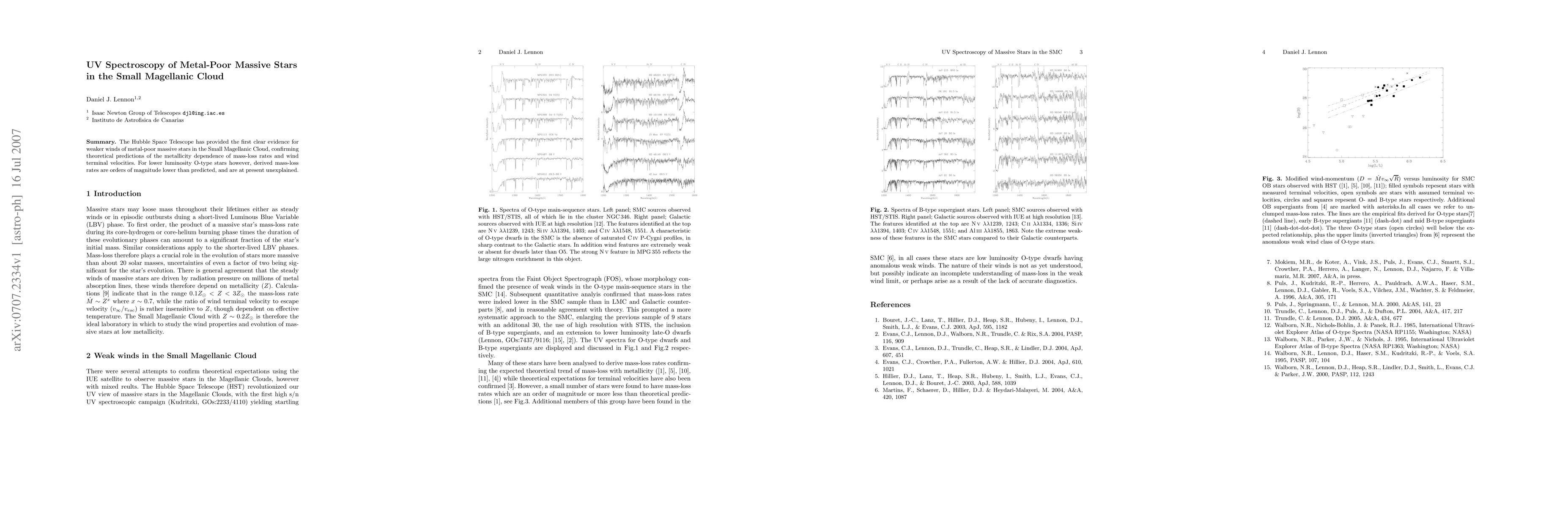 Summary: The Hubble Space Telescope reveals weaker winds in metal-poor massive stars in the Small Magellanic Cloud, supporting theoretical models of metallicity-dependent mass-loss rates. However, mass-loss rates for lower luminosity O-type stars are unexpectedly low and remain unexplained.