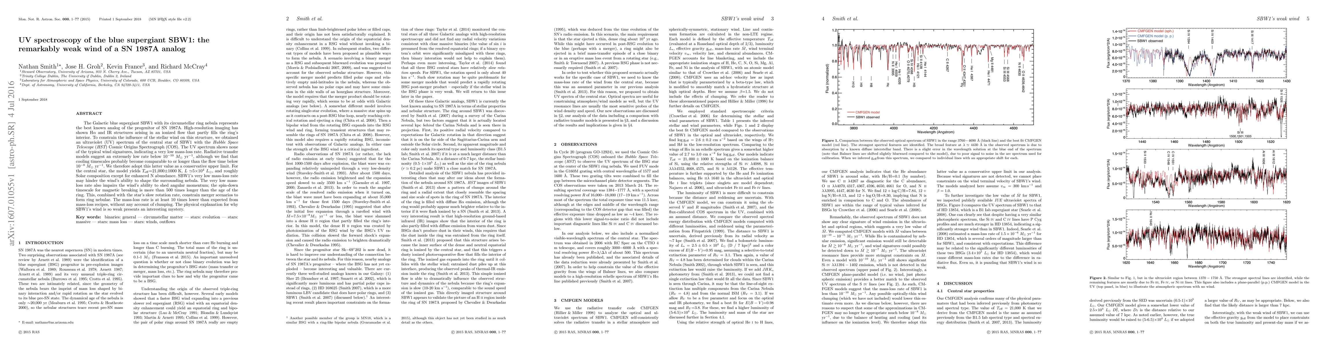 The Galactic blue supergiant SBW1 with its circumstellar ring nebula represents the best known analog of the progenitor of SN 1987A. High-resolution imaging has shown H-alpha and IR structures arising in an ionized flow that partly fills the ring's interior. To constrain the influence of the stellar wind on this structure, we obtained an ultraviolet (UV) spectrum of the central star of SBW1 with the HST Cosmic Origins Spectrograph (COS). The UV spectrum shows none of the typical wind signatures, indicating a very low mass-loss rate. Radiative transfer models suggest an extremely low rate below 10$^{-10}$ Msun/yr, although we find that cooling timescales probably become comparable to or longer than the flow time below 10$^{-8}$ Msun/yr. We therefore adopt this latter value as a conservative upper limit. For the central star, the model yields $T_{\rm eff}$=21,000$\pm$1000 K, $L\simeq$5$\times$10$^4$ $L_{\odot}$, and roughly Solar composition except for enhanced N abundance. SBW1's very low mass-loss rate may hinder the wind's ability to shape the surrounding nebula. The very low mass-loss rate also impairs the wind's ability to shed angular momentum; the spin-down timescale for magnetic breaking is more than 500 times longer than the age of the ring. This, combined with the star's slow rotation rate, constrain merger scenarios to form ring nebulae. The mass-loss rate is at least 10 times lower than expected from mass-loss recipes, without any account of clumping. The physical explanation for why SBW1's wind is so weak presents an interesting mystery.