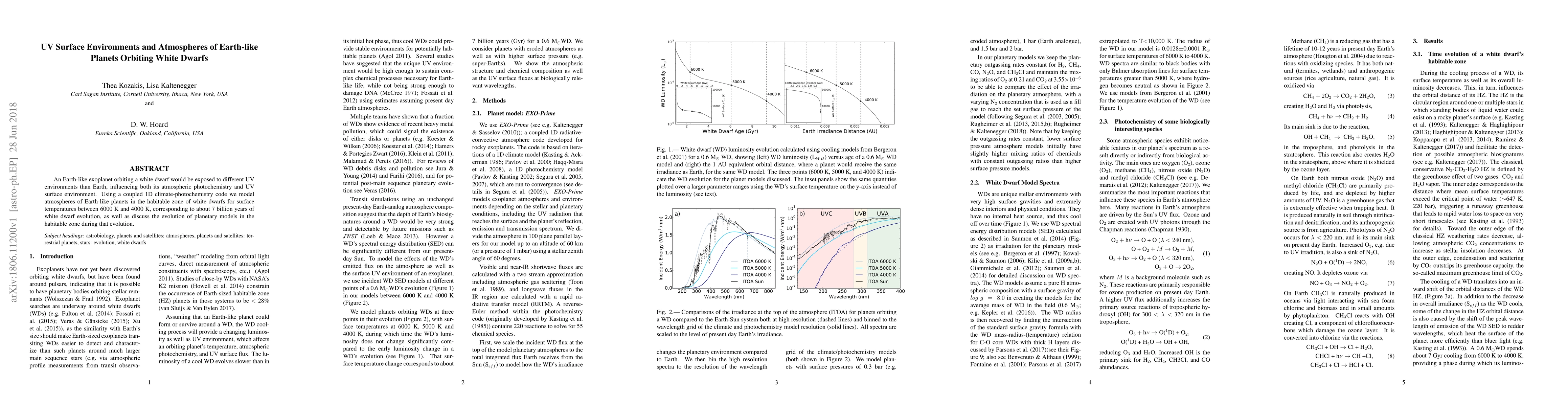 An Earth-like exoplanet orbiting a white dwarf would be exposed to different UV environments than Earth, influencing both its atmospheric photochemistry and UV surface environment. Using a coupled 1D climate-photochemistry code we model atmospheres of Earth-like planets in the habitable zone of white dwarfs for surface temperatures between 6000 K and 4000 K, corresponding to about 7 billion years of white dwarf evolution, as well as discuss the evolution of planetary models in the habitable zone during that evolution.