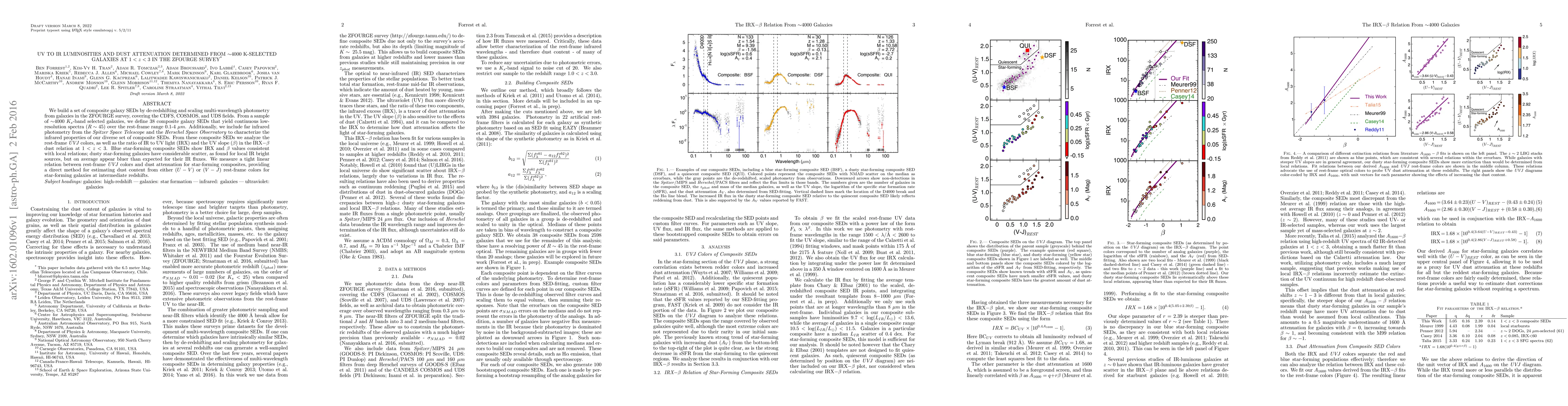 This paper constructs composite galaxy spectral energy distributions (SEDs) from ~4000 K-band selected galaxies in the ZFOURGE survey, analyzing UV to IR luminosities and dust attenuation. It finds a tight correlation between UVJ colors and dust attenuation for star-forming galaxies, offering a method to estimate dust content from UVJ colors at intermediate redshifts.