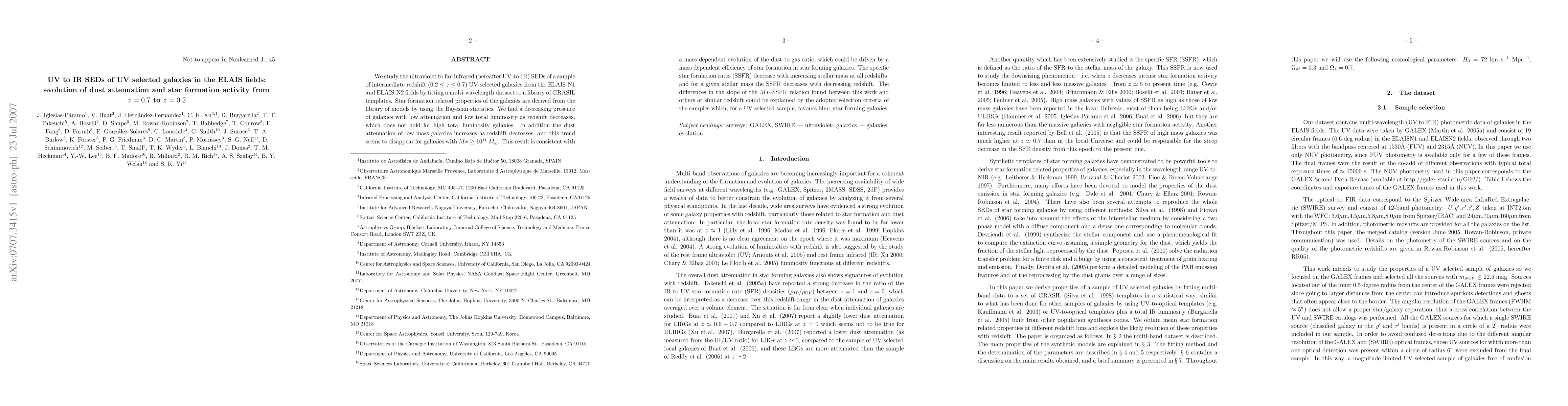 This research examines the UV-to-IR spectral energy distributions (SEDs) of UV-selected galaxies at intermediate redshifts (0.2 < z < 0.7) in the ELAIS fields, revealing a mass-dependent evolution in dust attenuation and star formation activity. The study finds that low mass galaxies show increasing dust attenuation as redshift decreases, indicating a mass-dependent evolution in the dust-to-gas ratio.