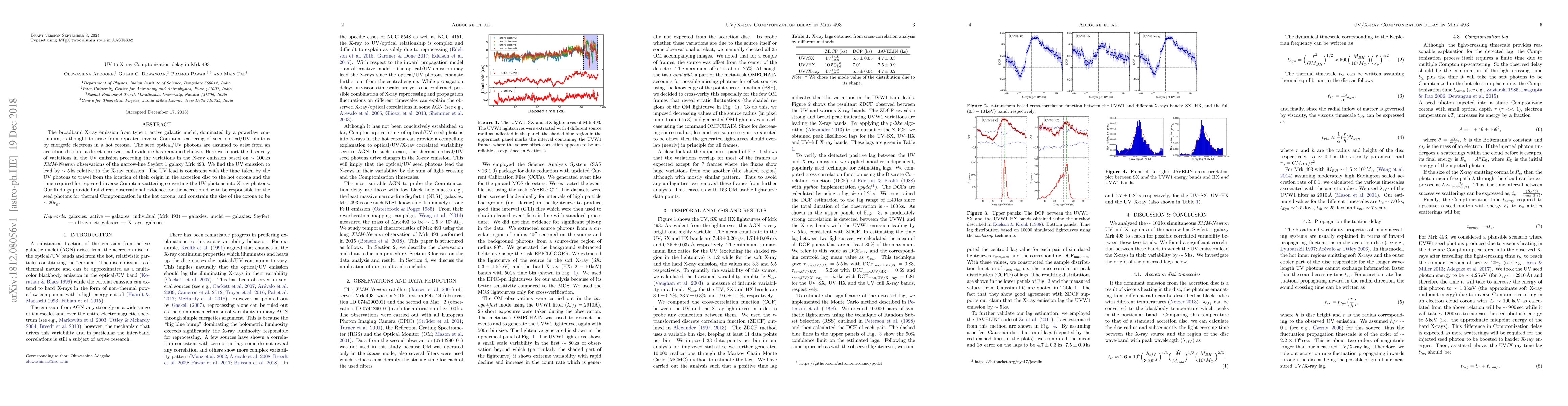The broadband X-ray emission from type 1 active galactic nuclei, dominated by a powerlaw continuum, is thought to arise from repeated inverse Compton scattering of seed optical/UV photons by energetic electrons in a hot corona. The seed optical/UV photons are assumed to arise from an accretion disc but a direct observational evidence has remained elusive. Here we report the discovery of variations in the UV emission preceding the variations in the X-ray emission based on $\sim100\,\mathrm{ks}$ XMM-Newton observations of the narrow-line Seyfert 1 galaxy Mrk 493. We find the UV emission to lead by $\sim5\,\mathrm{ks}$ relative to the X-ray emission. The UV lead is consistent with the time taken by the UV photons to travel from the location of their origin in the accretion disc to the hot corona and the time required for repeated inverse Compton scattering converting the UV photons into X-ray photons. Our findings provide first direct observational evidence for the accretion disc to be responsible for the seed photons for thermal Comptonization in the hot corona, and constrain the size of the corona to be $\sim20r_{g}$.