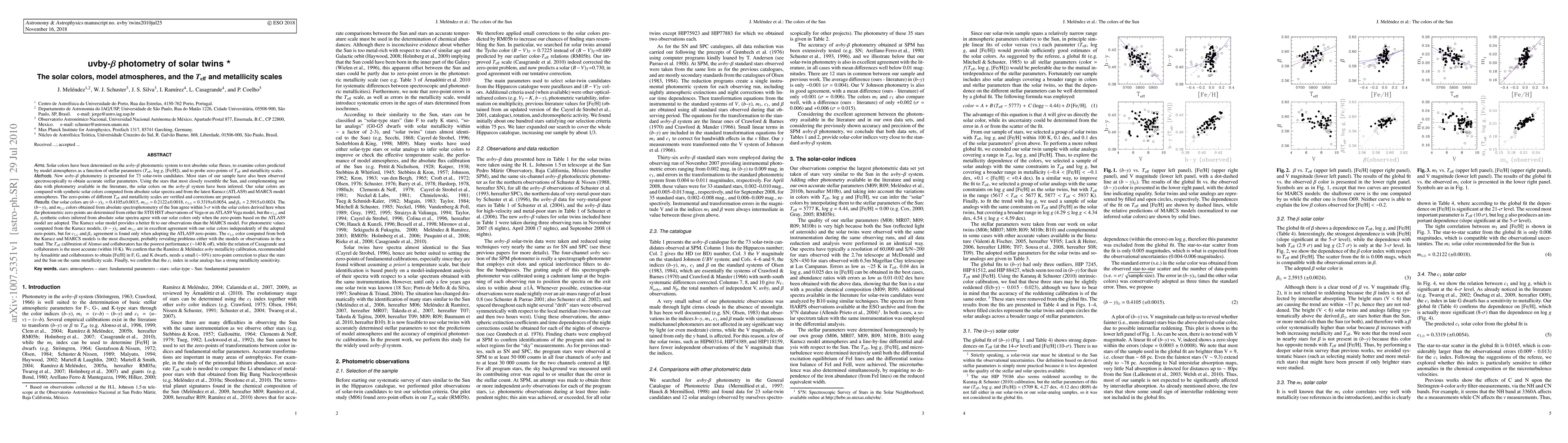 This paper presents new uvby-$\beta$ photometry for 73 solar-twin candidates to determine solar colors and calibrate Teff and metallicity scales. The study finds that the Casagrande et al. (2010) Teff relation is most accurate, while the Alonso et al. Teff calibration needs correction. A small (~10%) adjustment is recommended for the Ramirez & Melendez metallicity calibration.