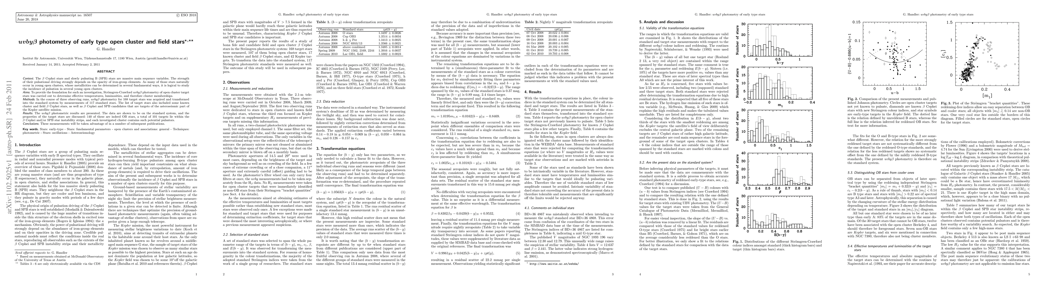 The beta Cephei stars and slowly pulsating B (SPB) stars are massive main sequence variables. The strength of their pulsational driving strongly depends on the opacity of iron-group elements. As many of those stars naturally occur in young open clusters, whose metallicities can be determined in several fundamental ways, it is logical to study the incidence of pulsation in several young open clusters. To provide the foundation for such an investigation, Str\"omgren-Crawford uvbybeta photometry of open cluster target stars was carried out to determine effective temperatures, luminosities, and therefore cluster memberships. In the course of three observing runs, uvbybeta photometry for 168 target stars was acquired and transformed into the standard system by measurements of 117 standard stars. The list of target stars also included some known cluster and field beta Cephei stars, as well as beta Cephei and SPB candidates that are targets of the asteroseismic part of the Kepler satellite mission. The uvbybeta photometric results are presented. The data are shown to be on the standard system, and the properties of the target stars are discussed: 140 of these are indeed OB stars, a total of 101 targets lie within the beta Cephei and/or SPB star instability strips, and each investigated cluster contains such potential pulsators. These measurements will be taken advantage of in a number of subsequent publications.