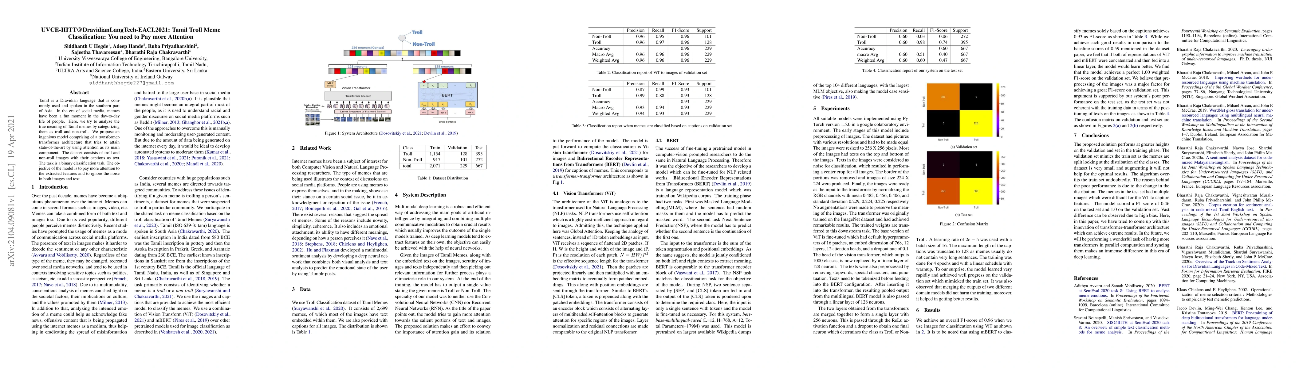 Tamil is a Dravidian language that is commonly used and spoken in the southern part of Asia. In the era of social media, memes have been a fun moment in the day-to-day life of people. Here, we try to analyze the true meaning of Tamil memes by categorizing them as troll and non-troll. We propose an ingenious model comprising of a transformer-transformer architecture that tries to attain state-of-the-art by using attention as its main component. The dataset consists of troll and non-troll images with their captions as text. The task is a binary classification task. The objective of the model is to pay more attention to the extracted features and to ignore the noise in both images and text.