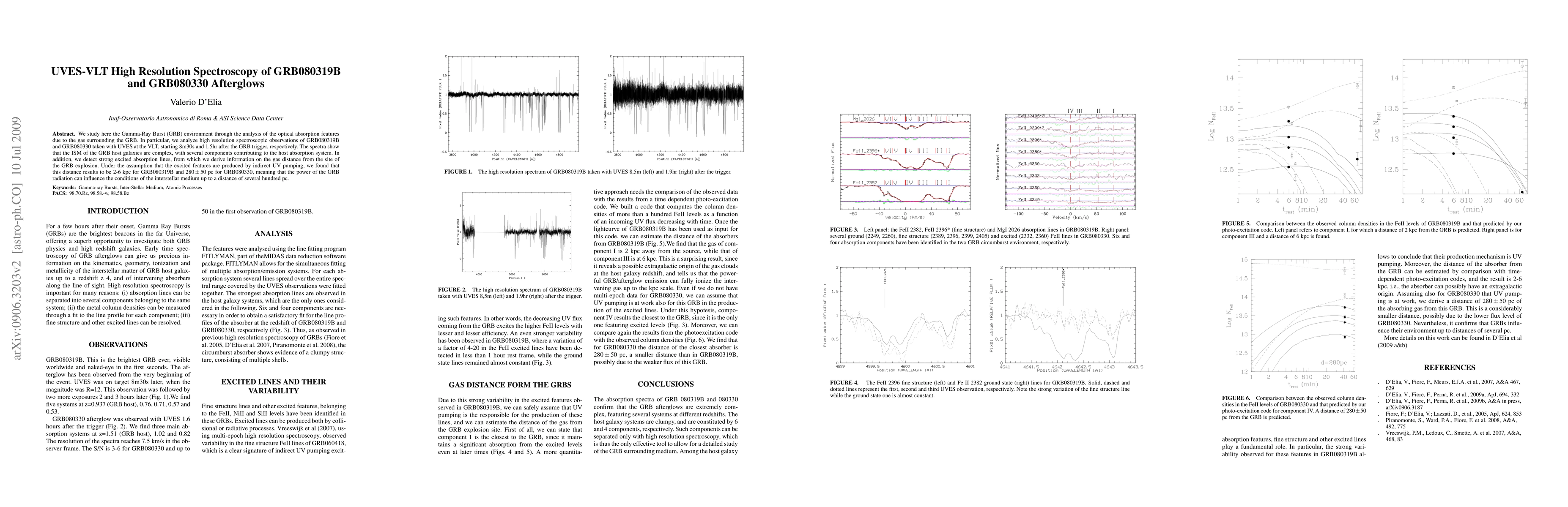This paper analyzes high-resolution spectroscopy of GRB080319B and GRB080330 afterglows using UVES-VLT, revealing complex interstellar medium (ISM) in the host galaxies. It finds that the GRB radiation can influence the ISM up to several hundred parsecs away, with distances of 2-6 kpc for GRB080319B and 280±50 pc for GRB080330.