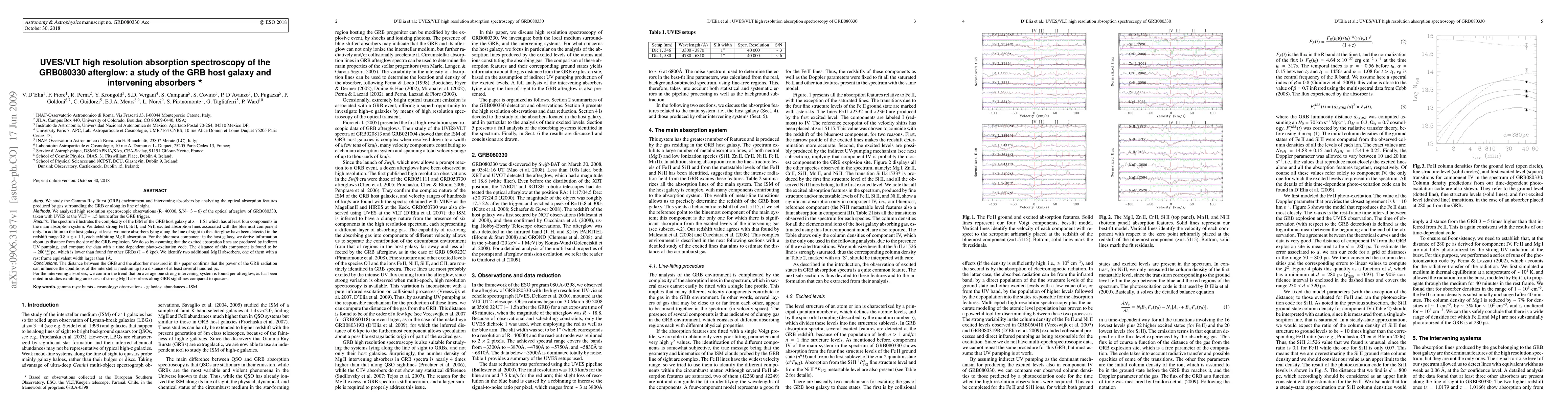 We study the Gamma Ray Burst (GRB) environment and intervening absorbers by analyzing the optical absorption features produced by gas surrounding the GRB or along its line of sight. We analyzed high resolution spectroscopic observations (R=40000, S/N=3 - 6) of the optical afterglow of GRB080330, taken with UVES at the VLT ~ 1.5 hours after the GRB trigger. The spectrum illustrates the complexity of the ISM of the GRB host galaxy at z = 1.51 which has at least four components in the main absorption system. We detect strong FeII, SiII, and NiII excited absorption lines associated with the bluemost component only. In addition to the host galaxy, at least two more absorbers lying along the line of sight to the afterglow have been detected in the redshift range 0.8 < z < 1.1, each exhibiting MgII absorption. For the bluemost component in the host galaxy, we derive information about its distance from the site of the GRB explosion. We do so by assuming that the excited absorption lines are produced by indirect UV pumping, and compare the data with a time dependent photo-excitation code. The distance of this component is found to be 280+40-50 pc, which is lower than found for other GRBs (1 - 6 kpc). We identify two additional MgII absorbers, one of them with a rest frame equivalent width larger than 1A. The distance between the GRB and the absorber measured in this paper confirms that the power of the GRB radiation can influence the conditions of the interstellar medium up to a distance of at least several hundred pc. For the intervening absorbers, we confirm the trend that on average one strong intervening system is found per afterglow, as has been noted in studies exhibiting an excess of strong MgII absorbers along GRB sightlines compared to quasars.